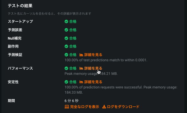 カスタムモデルのテストフレームワークが強化され、モデルテストの設定、実行、履歴の確認を行う時のエクスペリエンスが向上しました。モデルのメモリーとレプリカを設定し、望ましい予測SLAを実現します。個々のテストから、具体的なインサイトを入手できるようになりました。例えば、パフォーマンスチェックインサイトでは、ペイロードのサンプルサイズを変えた場合の予測レイテンシーのタイミングが表に表示されます。