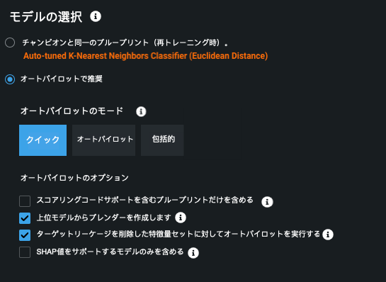 オートパイロットとモデル選択オプションの追加に対応するために、自動再トレーニングの機能が強化されました。再トレーニングはどのオートパイロットモードでも実行可能となり、トップモデルからアンサンブルを作成できるようになりました。さらに、モデリング時にSHAP値対応のモデルのみを検索したり、ターゲットリーケージを除去した特徴量セットを使用したりすることも可能です。これらのモデリングオプションの強化により、モデリングおよびデプロイ後のエクスペリエンスを改善できます。