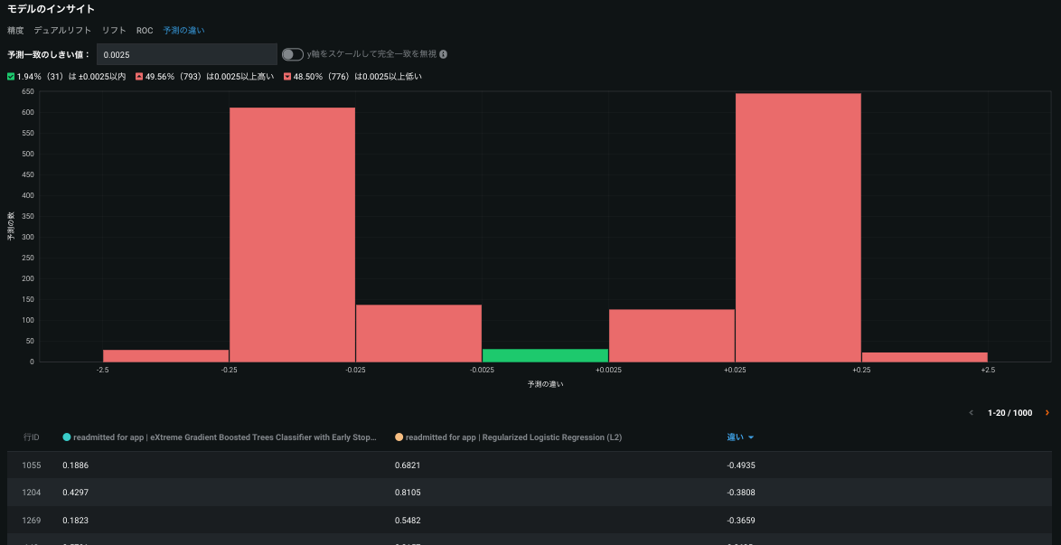 予測差分タブでは、行単位でモデルの予測を比較できます。
