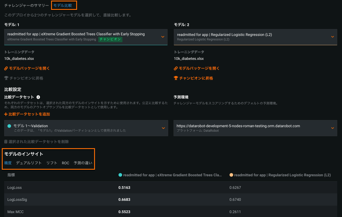 モデル比較ページでは、比較用のモデルの選択と、モデルインサイトの下で貴重なデータとビジュアライゼーションを提供できます。