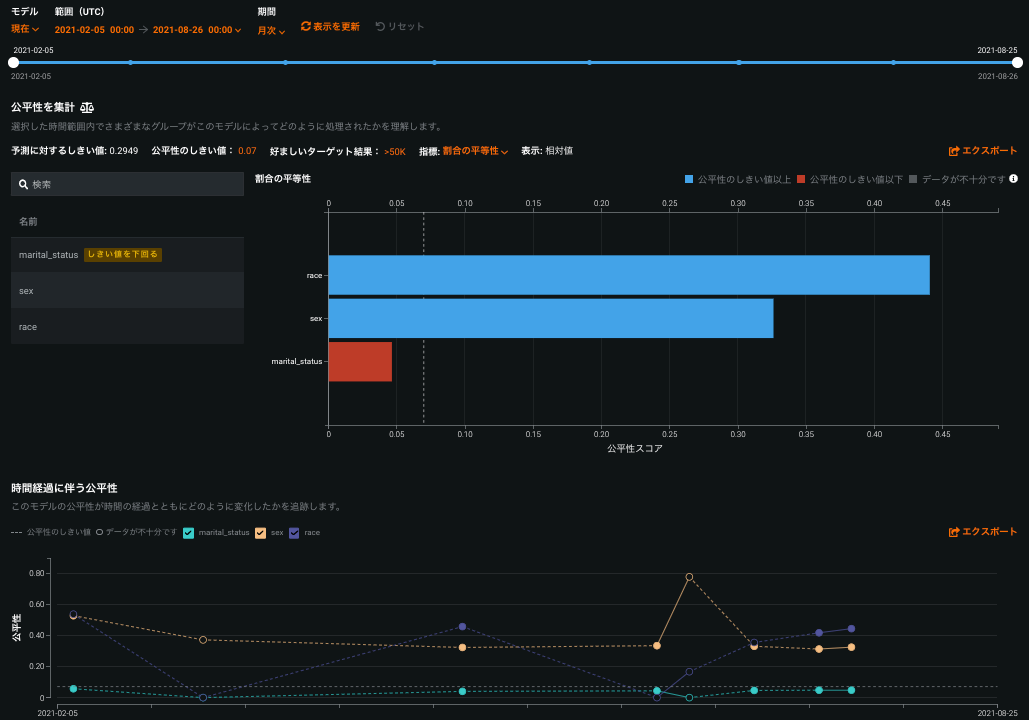 個々のモデルの公平性タブには、「クラスごとのバイアス」と「時間経過に伴う公平性」の2つのインタラクティブチャートとエクスポートチャートが表示され、デプロイが公平性テストに失敗する理由や、事前定義済み公平性のしきい値を下回っている機能を理解するのに役立ちます。