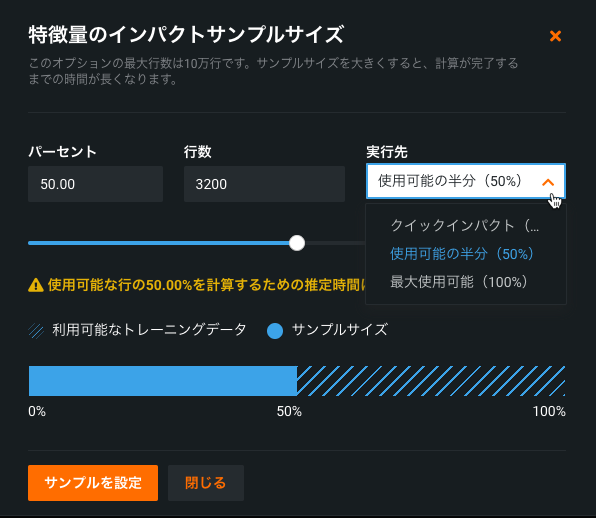 このリリースでは、SHAPベースのプロジェクトで特徴量のインパクトの計算に使用されるサンプルサイズを設定できるようになりました。以前は、この機能はpermutationベースの特徴量のインパクトにしか使用できませんでした。サイズ変更は、たとえば、ほぼ同じ精度でSHAP特徴量のインパクトを迅速に計算する上で役立ちます。