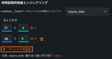 自動特徴量探索では、データセットあたり最大3つの派生ウィンドウ(FDW)を設定できるようになりました。追加ウィンドウを定義するには、時間認識特徴量エンジニアリングエディターを開き、追加ウィンドウをクリックします。各FDWは一意である必要があります。