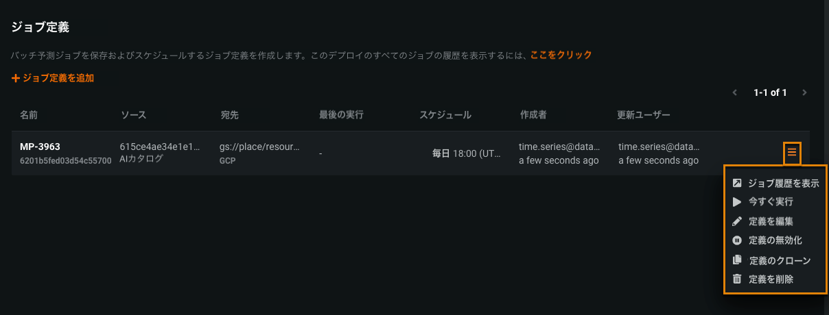 既存のジョブの説明のコピーを作成し、ジョブ定義のアクションメニューでクローンの定義を選択して更新できます。必要に応じてフィールドを更新し、予測ジョブ定義の保存をクリックします。ジョブのスケジュール設定はデフォルトでオフになっていることに注意してください。