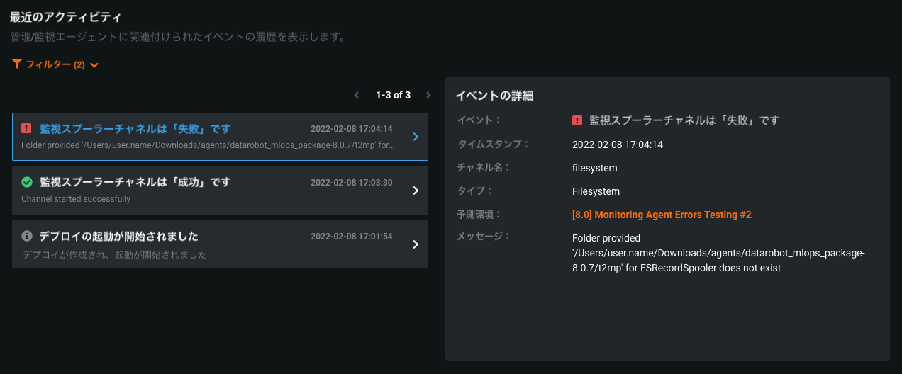 監視イベントを表示するには、エージェント設定ファイル(conf\mlops.agent.conf.yaml)でpredictionEnvironmentIDを指定する必要があります。MLOpsエージェントをまだインストールおよび設定していない場合は、 インストールと設定ガイドを参照してください。