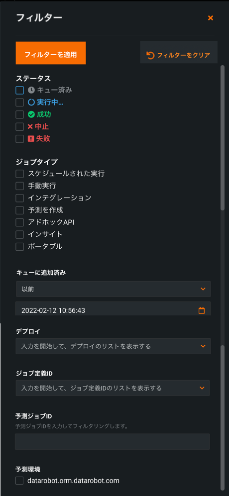 予測ジョブタブから、既存のフィルター(ステータス、ジョブタイプ(ジョブの生成に使用された方法に基づく)、ジョブの開始時間と終了時間、デプロイ、ジョブ定義ID、予測ジョブIDおよび予測環境)に加えて、予測ジョブIDでフィルター処理できるようになりました。