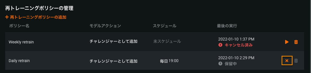 デプロイ済みモデルの自動再トレーニングを管理するには、再トレーニングポリシーを設定します。ポリシーは、手動でトリガーすることも、スケジュール、ドリフトステータス、または精度ステータスに応じてトリガーすることもできます。進行中またはスケジュール済みポリシーの実行をキャンセルできるようになりました。実行が正常に終了した場合、失敗した場合、「チャレンジャーの作成」または「モデルの置換」のステータスの場合、またはすでにキャンセルされている場合は、実行をキャンセルすることはできません。