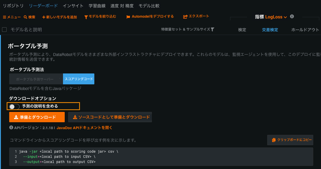 ポータブル予測ページのリーダーボードスコアリングコード機能が更新され、デプロイのポータブル予測ページの機能と一致するようになりました。このページには、スコアリングコードに予測の説明を含めるオプションも含まれるようになりました。