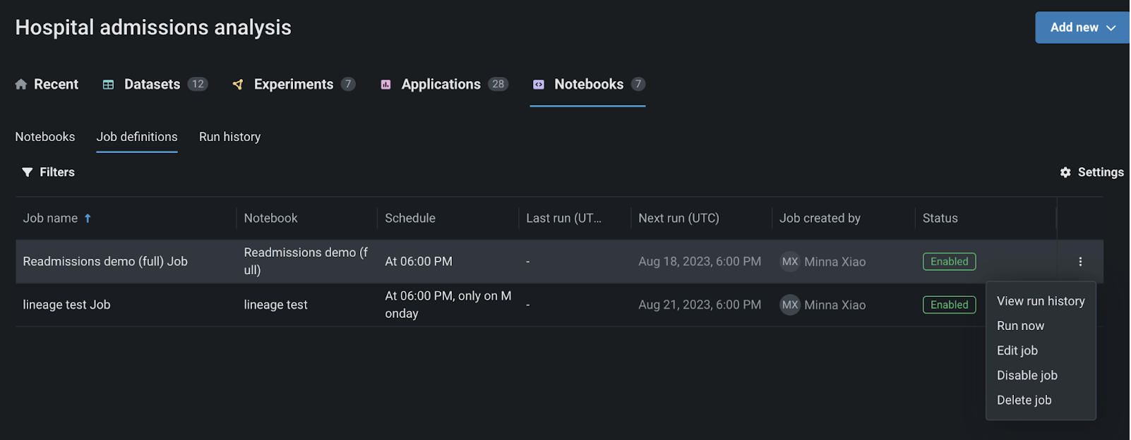 プレビュー版の機能です。ノートブックを非対話モードでスケジュールどおりに実行することで、コードベースのワークフローを自動化できます。 ノートブックのスケジューリングは、ノートブックのジョブによって管理されます。 さらに、ノートブックをパラメーター化することで、ノートブックのスケジューリングによって可能になる自動化を強化できます。 ノートブック内の特定の値をパラメーターとして定義することで、実行ごとに値を変更するためにノートブック自体を継続的に修正する必要がなく、ノートブックジョブの実行時にこれらのパラメーターに入力を提供できます。