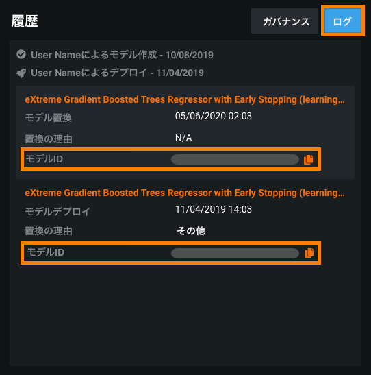 さらに、作成日とデプロイ日、モデル置換イベントなど、デプロイのモデル関連イベントを履歴 > ログで確認できます。 このログから、以前にデプロイされたモデルのモデルIDをコピーすることができます。