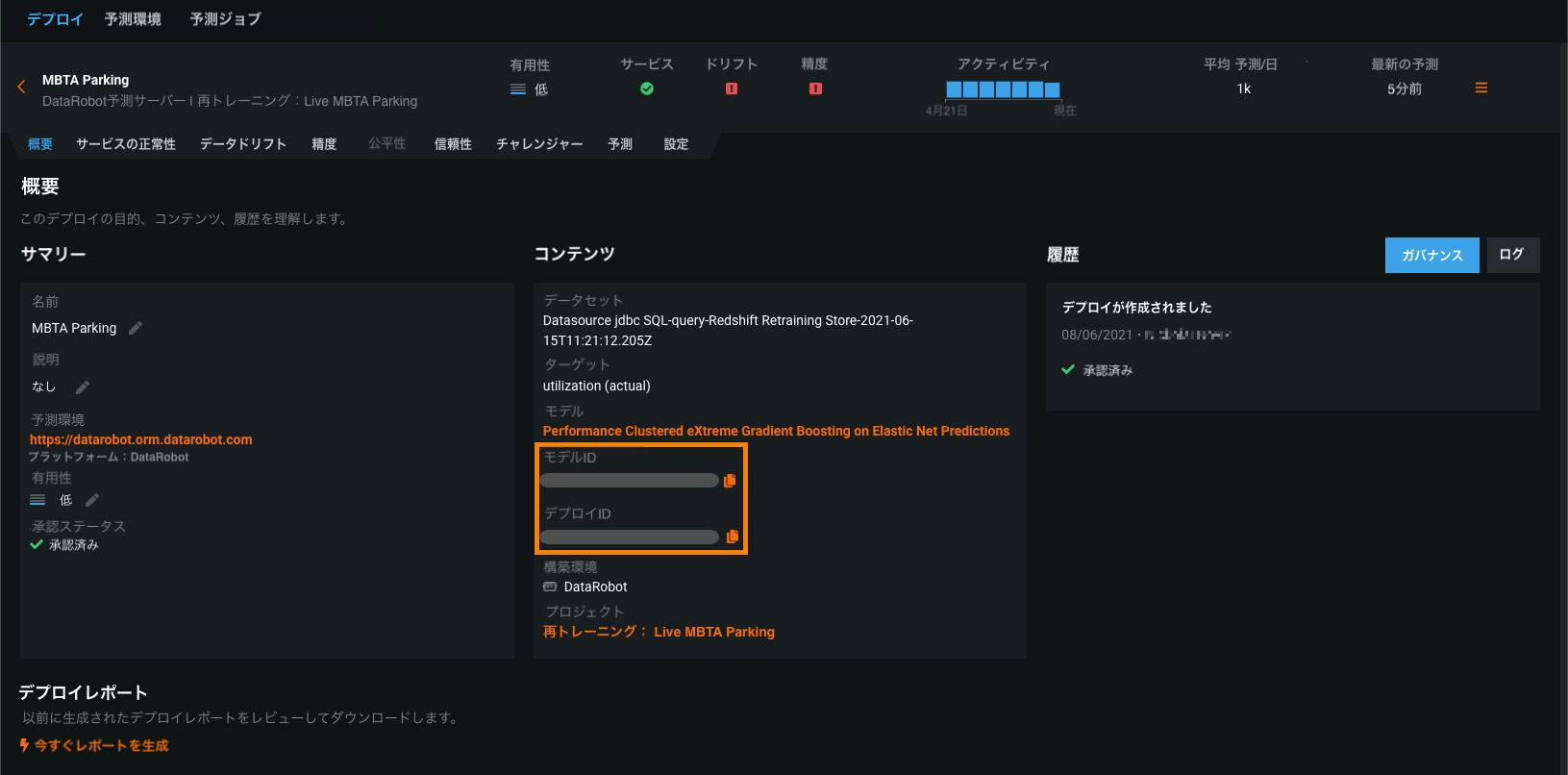 概要タブのコンテンツセクションには、デプロイのモデルおよび環境固有の情報が一覧表示され、次のIDが含まれるようになりました。