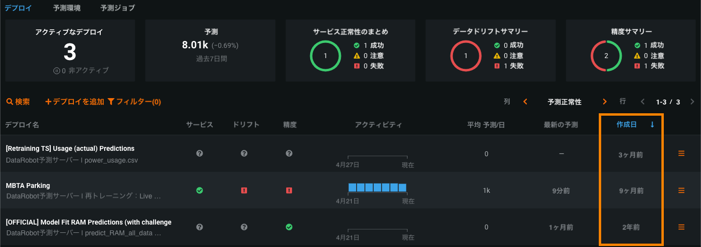 デプロイページのデプロイインベントリは、作成日順(新しい作成日列に従って、日付が新しい順)に並べ替えられるようになりました。 別の列のタイトルをクリックすると、代わりにその指標で並べ替えることができます。 ソート列のヘッダーの横に青い矢印が表示され、昇順か降順かが示されます。