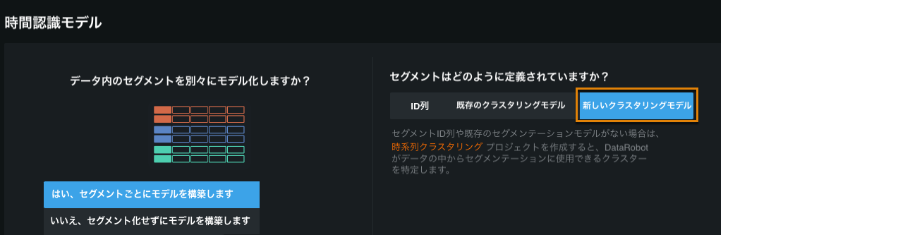 新しいセグメンテーションで使用タブでは、セグメントモデリングプロジェクトでクラスターを使用できるようにします。