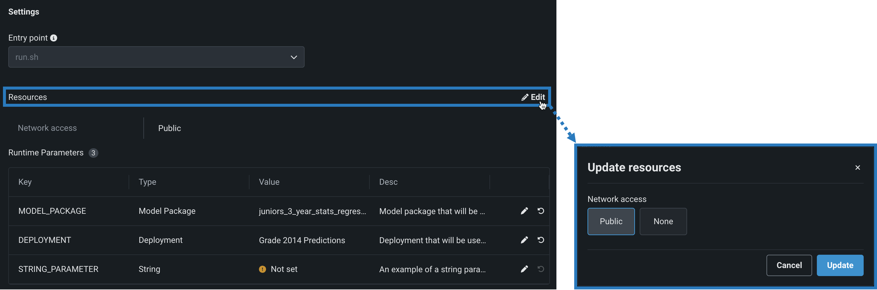 _マネージドAIプラットフォーム_では、ネットワークアクセスはデフォルトでパブリックに設定されていますが、変更可能です。 _セルフマネージドAIプラットフォーム_では、ネットワークアクセスはデフォルトでなしに設定されており、制限があります。ただし、管理者は、DataRobotプラットフォームの設定時にこれを変更できます。 詳細については、DataRobotの担当者または管理者にお問い合わせください。