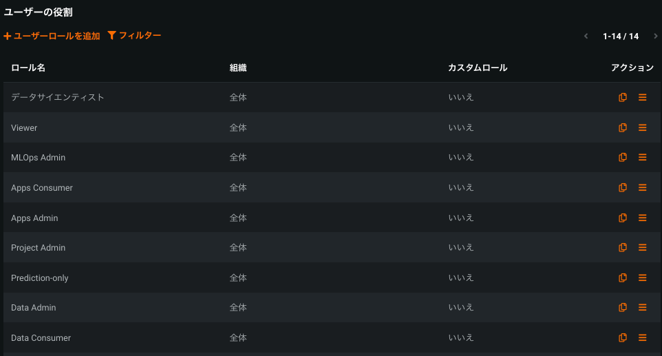 ユーザー設定 > ユーザーロールからカスタムRBACにアクセスできます。ここには、DataRobotのデフォルトのロールなど、管理者が組織内のユーザーに割り当てることができる利用可能な各ロールが一覧表示されます。