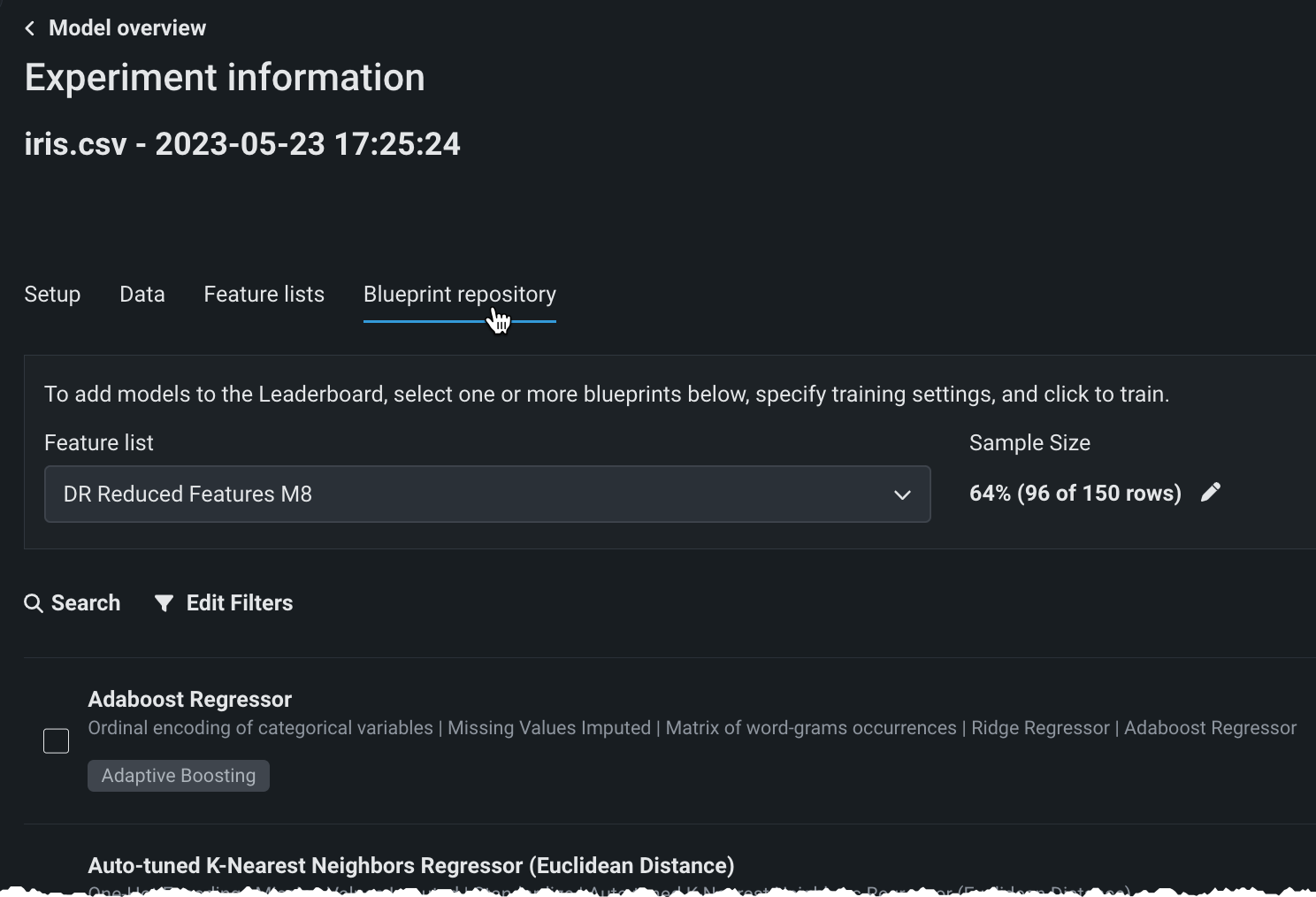 このデプロイでは、モデリングブループリントのライブラリであるブループリントリポジトリがワークベンチに導入されました。 クイックオートパイロットを実行した後、リポジトリにアクセスして、DataRobotがデフォルトで実行しなかったブループリントを選択することができます。 特徴量セットとサンプルサイズ(または時間認識の場合はトレーニング期間)を選択すると、DataRobotはブループリントを構築し、生成されたモデルをリーダーボードとエクスペリメントに追加します。