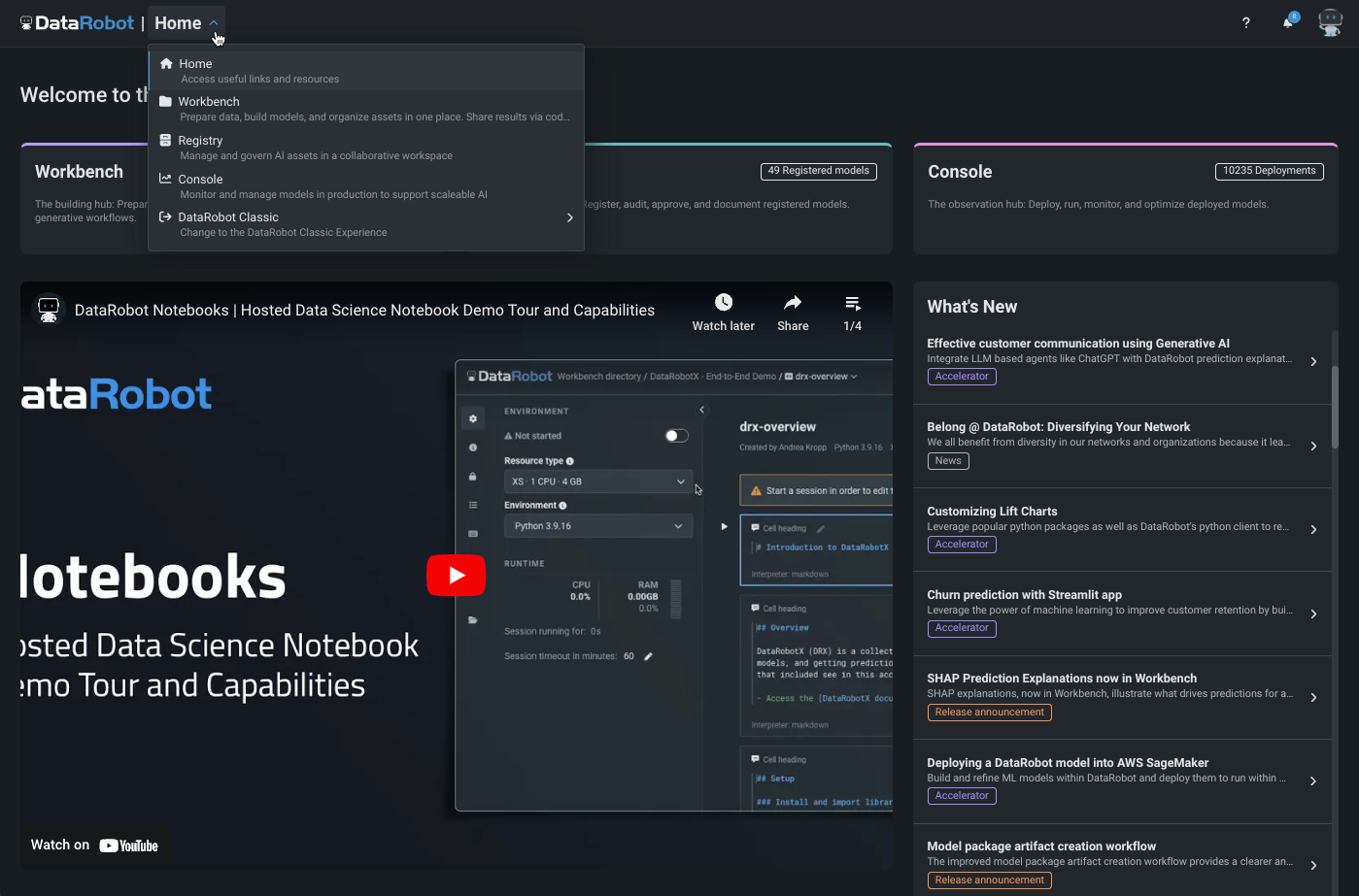新しいDataRobotホームページでは、DataRobotで成果を上げるために必要なすべての情報にアクセスできます。 右側のペインには、新しくリリースされた機能やアクセラレーター、ニュース項目の概要が表示されます。 詳細については、それぞれをクリックしてください。 中央には、今月のお勧めYouTube動画と、初心者向けの再生リストが表示されます。 ページ上部のタブでは、ワークベンチ、レジストリ、コンソールでのアクティビティがレポートされますが、それらを起動することも可能です。 下部にあるタブには、アプリケーション外のDataRobotサイト(ドキュメント、サポート、コミュニティ、DataRobot University)へのクイックリンクがあります。