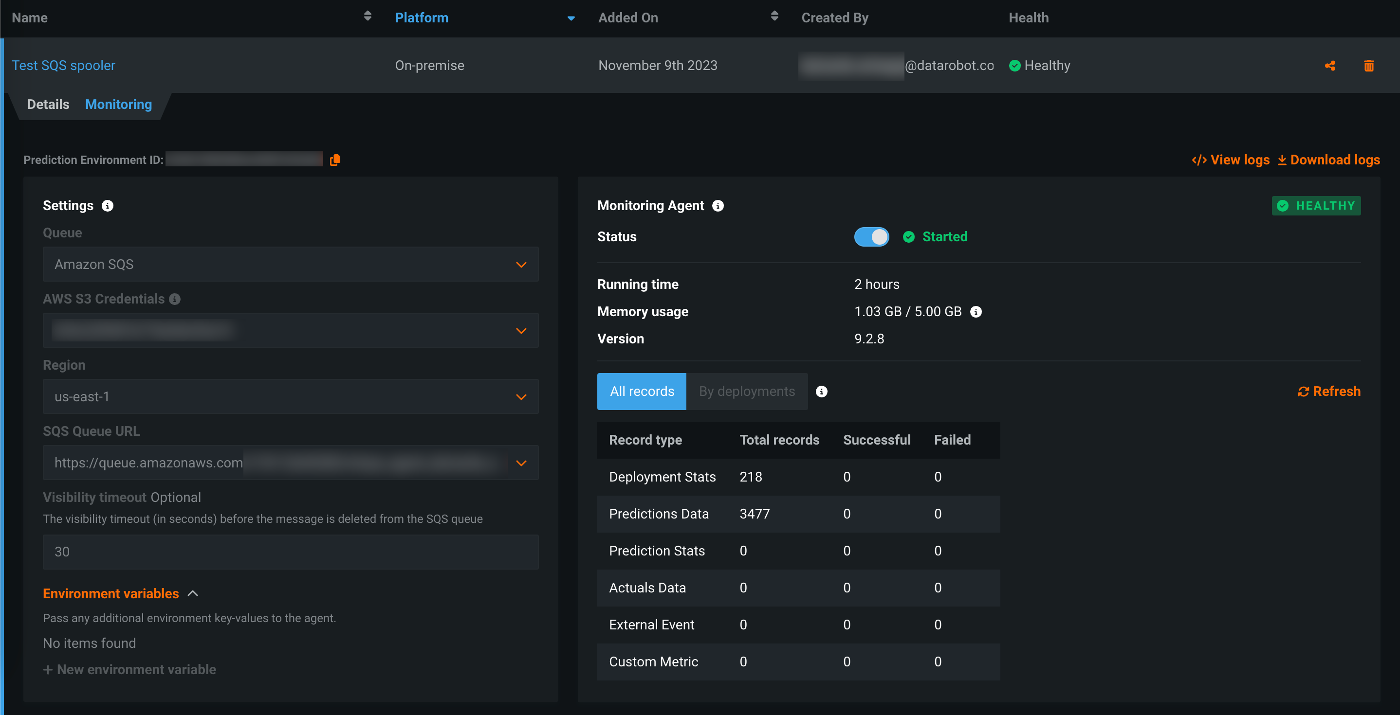 通常、監視エージェントはDataRobotの外部で実行され、外部モデルのコードでDataRobot MLOpsライブラリの呼び出しによって設定されたスプーラーから指標を報告します。 外部スプーラーの資格情報と設定の詳細を使用して外部予測環境を作成し、DataRobot_内_で監視エージェントを実行できるようになりました(プレビュー版の機能です)。