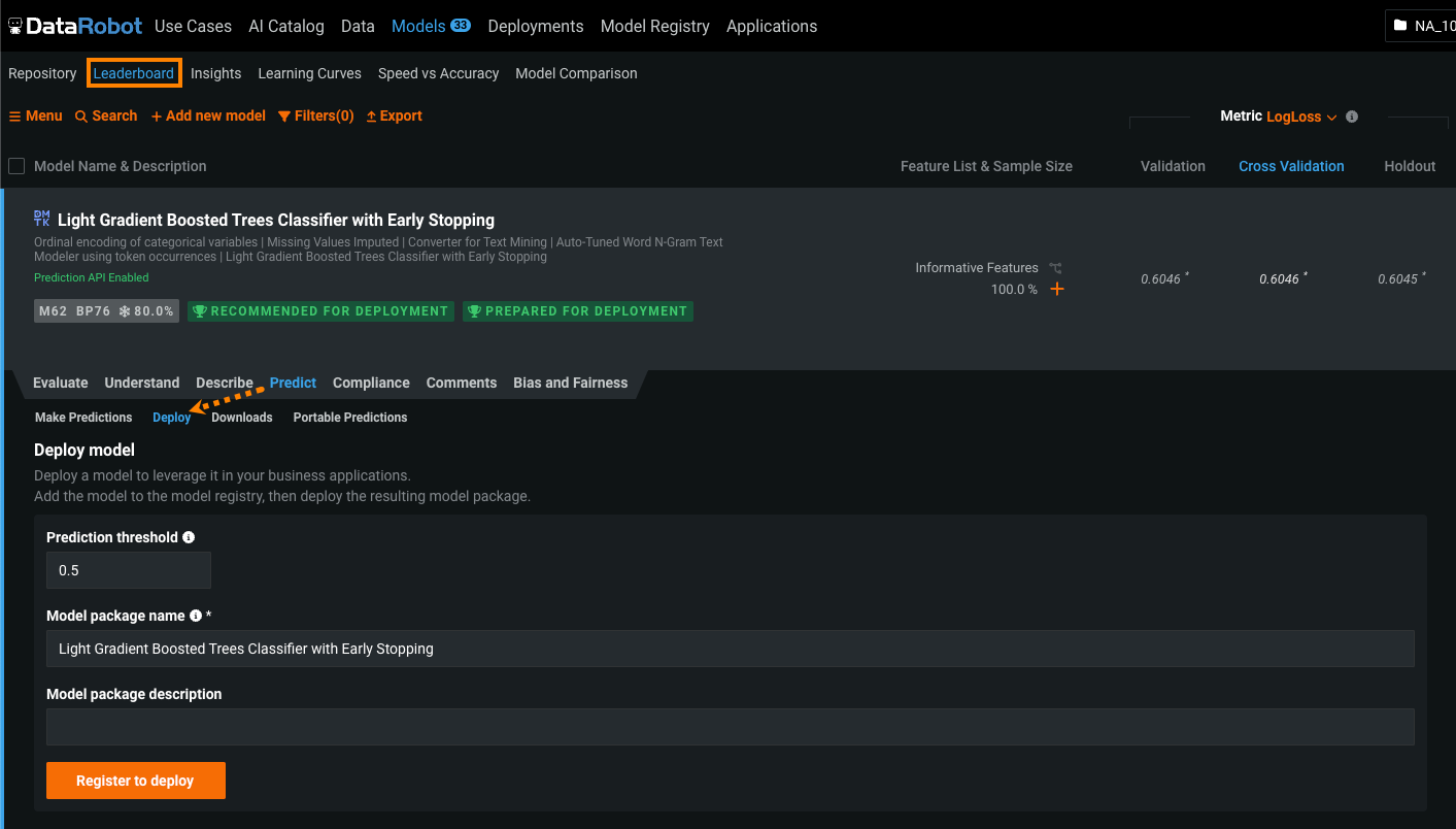 今回の変更は、以前のモデルパッケージワークフローの変更に基づいており、デプロイするモデルを登録する必要があります。 リーダーボードからモデルを登録してデプロイするには、まずモデルの登録情報を提供する必要があります。