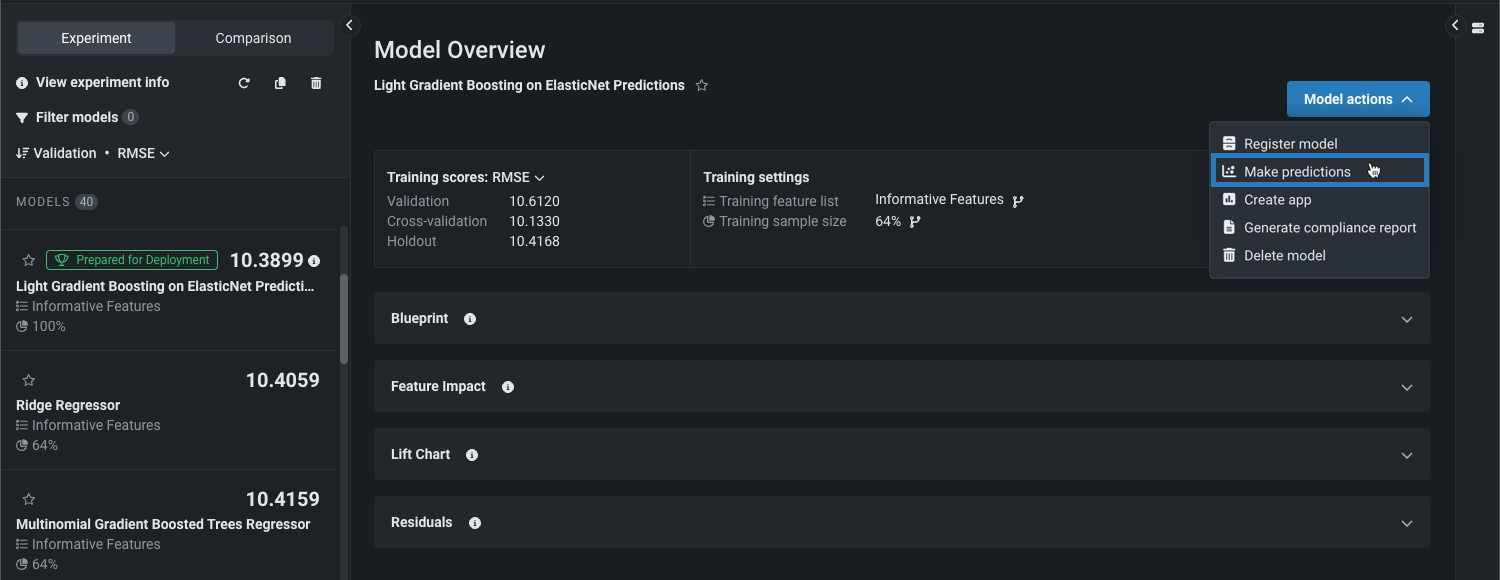 リーダーボードで、予測の生成に使用するモデルを選択します。 デプロイ推奨とデプロイの準備済みのバッジが付いたモデルをお勧めします。 モデル準備プロセスでは、特徴量のインパクトが実行され、特徴量の数を減らした特徴量セットでモデルが再トレーニングされて、より大きなサンプルサイズでトレーニングされた後、サンプル全体(日付/時刻で分割されたプロジェクトの最新データ)でトレーニングされます。