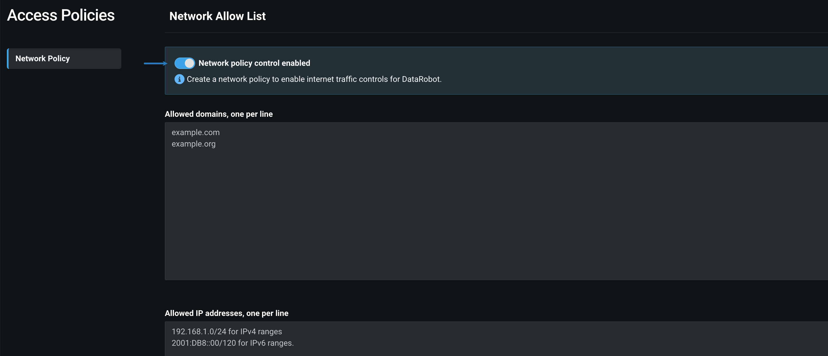 DataRobot内での公開リソースへのアクセスを制御するネットワークポリシーを管理¶