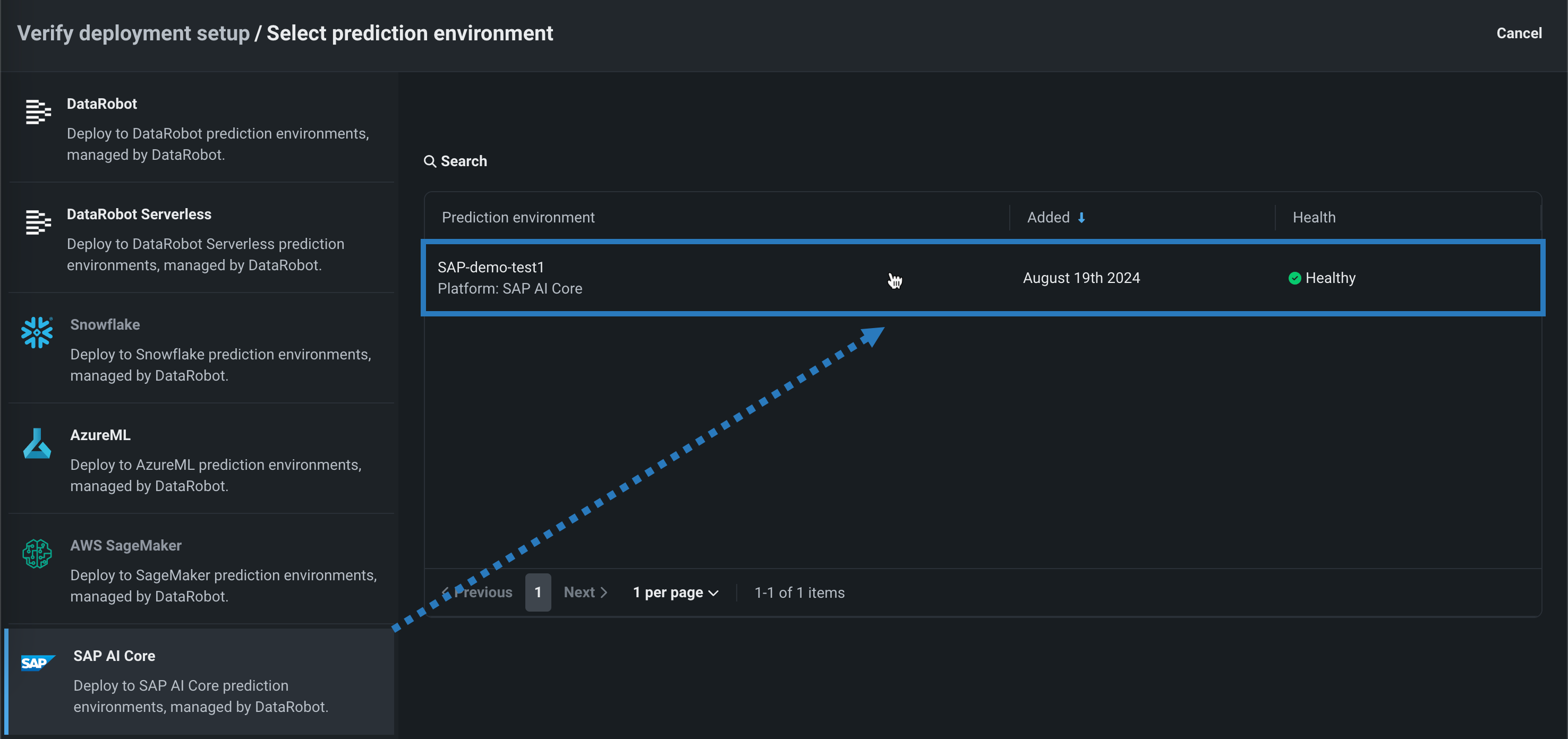 DataRobotのスコアリングコードをSAP AI Coreにデプロイするには、DataRobotが管理するSAP AI Coreの予測環境を作成します。 DataRobotの管理を有効にすることで、外部のSAP AI Coreにデプロイされたモデルは、スコアリングコードの自動置換を含むMLOpsの機能を利用できます。 SAP AI Coreの予測環境を作成したら、レジストリからその環境にスコアリングコード対応モデルをデプロイできます。
