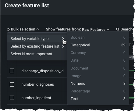 UIを使用して既存の予測エクスペリメントに新しいカスタム特徴量セットを追加する機能が、プレビュー機能として4月に導入されましたが、 一般提供機能になりました。リーダーボードからアクセスできるエクスペリメント情報ウィンドウの特徴量セットまたはデータタブ(どちらも一般提供機能になりました)から、独自の特徴量セットを作成できます。 一括選択を利用すると、ワンクリックで複数の特徴量を選択できます。