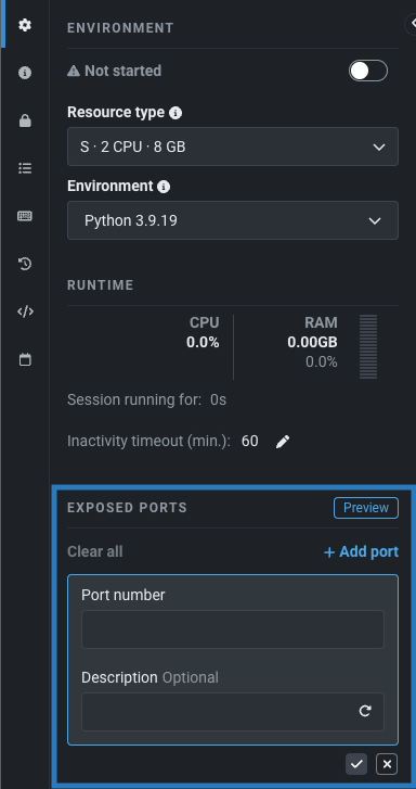 ノートブックとCodespacesの環境設定で、ポート転送を有効にして、MLflowやStreamlitなどのツールやライブラリによって起動されるWebアプリケーションにアクセスできるようになりました。 ローカルで開発する場合、Webアプリケーションはhttp://localhost:PORTでアクセスできます。しかし、ホストされたDataRobot環境で開発する場合、Webアプリケーションにアクセスするには、そのアプリケーションが実行されている(セッションコンテナ内の)ポートを転送する必要があります。