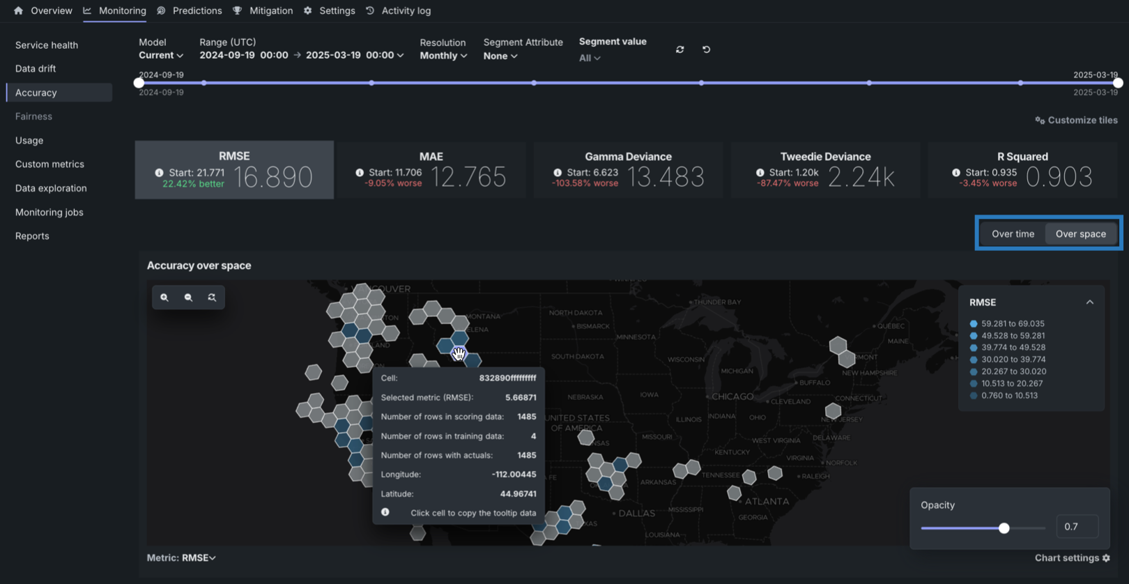 トレーニングデータセット内の位置データを使用して構築し、デプロイした二値分類、連続値、または多クラスモデルでは、DataRobotのLocation AIを活用して、デプロイのデータドリフトおよび精度タブで地理空間の監視ができるようになりました。 プロイで地理空間分析を有効にするには、セグメント化された分析を有効化し、位置データの取込み中に生成される位置特徴量geometryのセグメントを定義します。 geometryセグメントには、世界をH3セルのグリッドに分割する際に使われる識別子が含まれています。