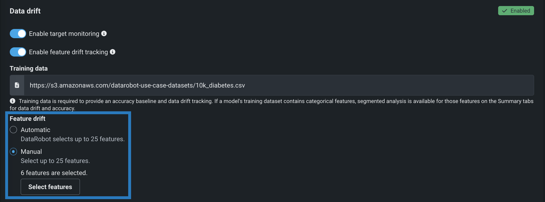 デプロイの特徴量ドリフト追跡を有効にした場合、追跡対象として選択した特徴量をカスタマイズできるようになりました。 デプロイプロセス中またはその後に、デプロイ設定の特徴量ドリフトセクションで、特徴量の選択方法(自動的に25個の特徴量を選択する、または最大25個の特徴量を手動で選択する)を選択します。