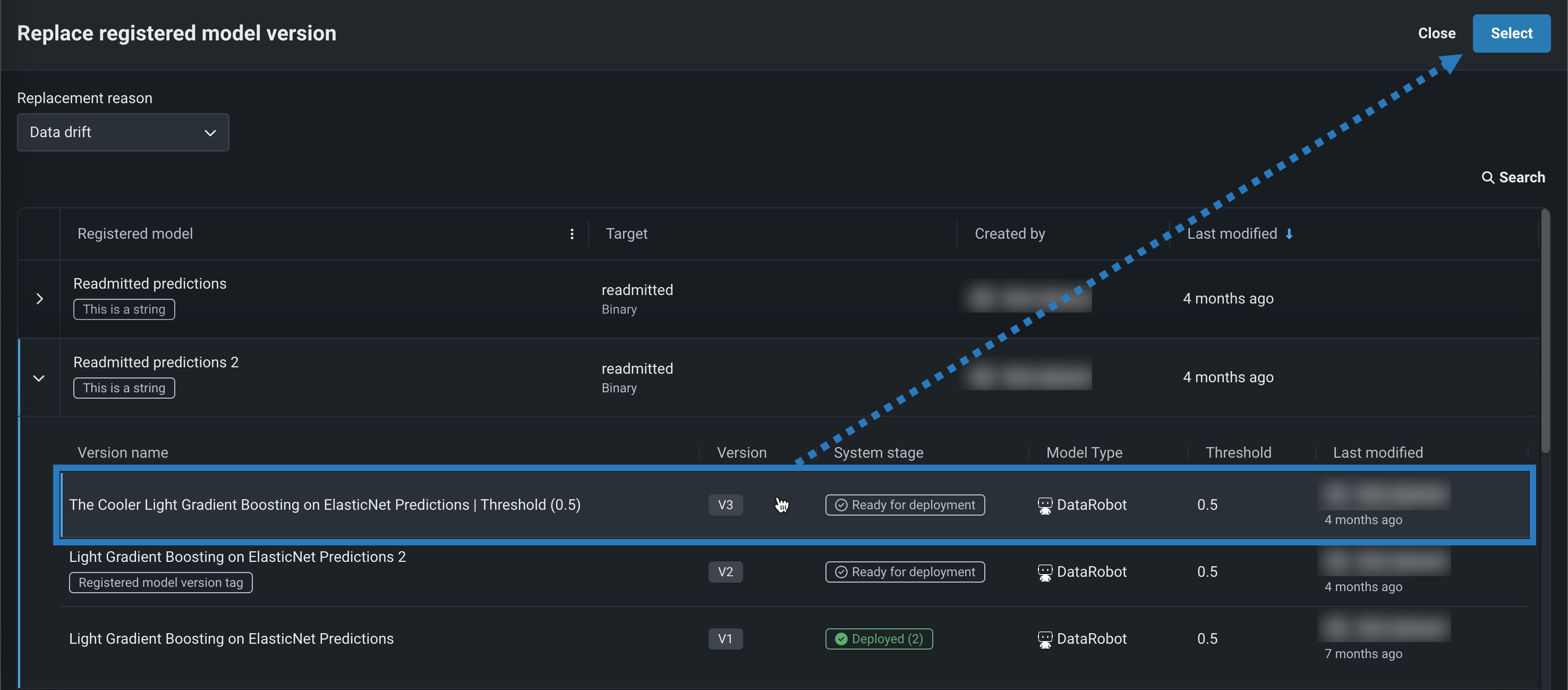 コンソール > デプロイタブ、またはデプロイの概要で、モデルのアクションメニューから、最新のモデル置換ワークフローにアクセスできます。