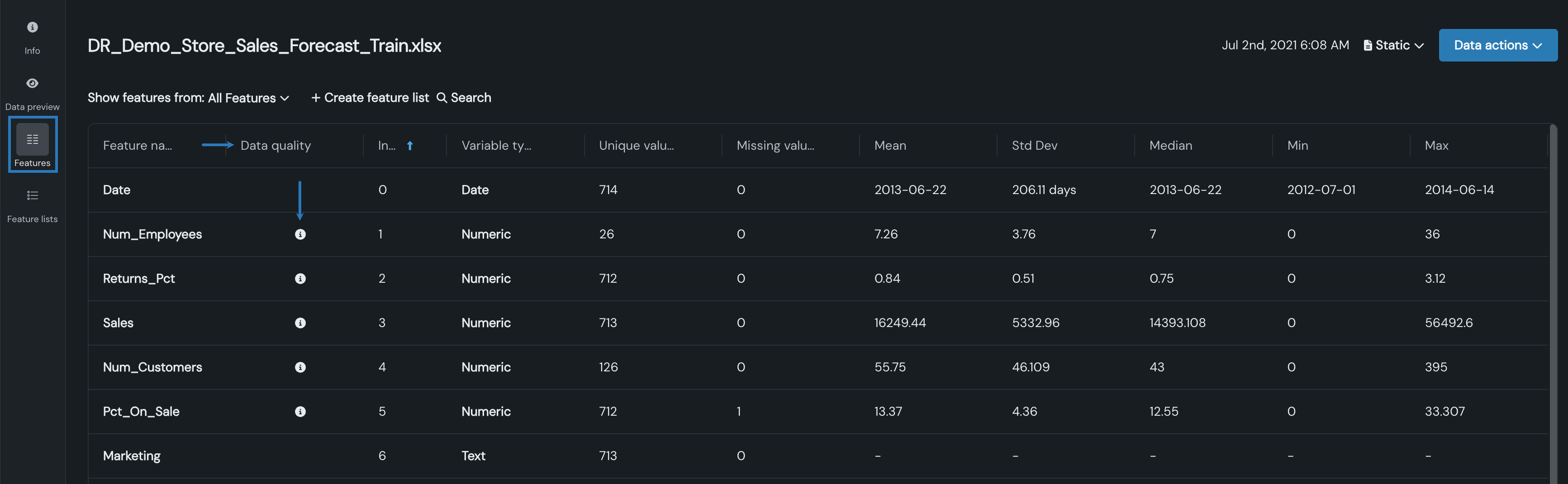 データ探索ページの特徴量タブでは、個々の特徴量のインサイトに加えて、データ品質チェックが指標として表示されます。
