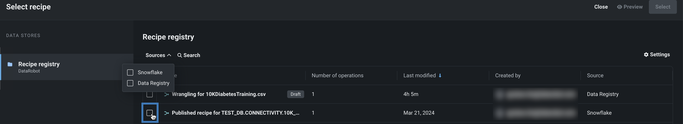 データレジストリからラングリングされたレシピでバッチ予測を行うには、デプロイの予測 > 予測を作成タブを使用します。 バッチ予測とは、大規模なデータセットで予測を行う方法で、入力データを渡すと各行の予測結果が得られます。 予測データセットボックスで、ファイルを選択 > ラングラーレシピをクリックし、データレジストリからレシピを選びます。