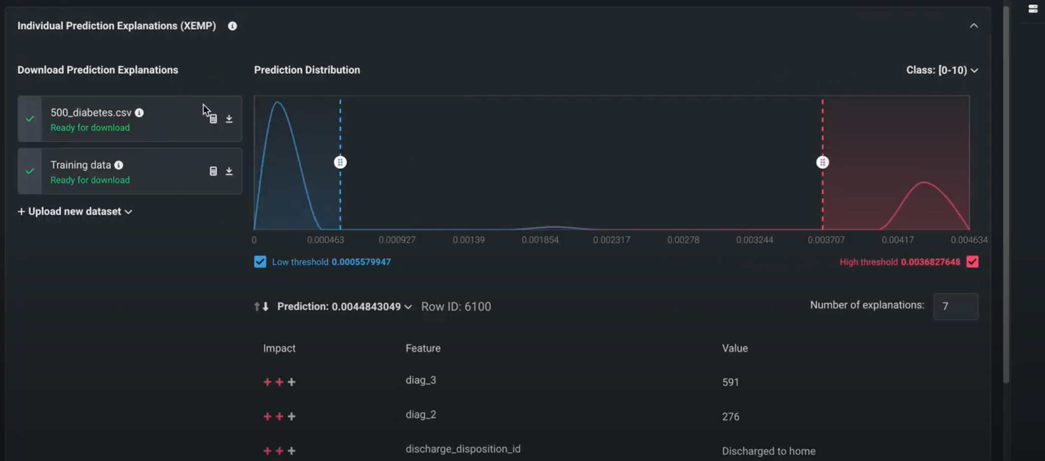ワークベンチでは、個々の予測の説明を2つの方法で計算できるようになりました。1つはSHAP(Shapley値に基づく)、もう1つはXEMP(eXemplarに基づくモデル予測の説明)です。 このインサイトは、方法に関係なく、予測の要因を説明するのに役立ちます。 XEMPベースの説明は、すべてのモデルをサポートする独自の方法であり、DataRobot Classicでは以前から利用できました。 ワークベンチでは、SHAPをサポートしていないエクスペリメントでのみ利用できます。