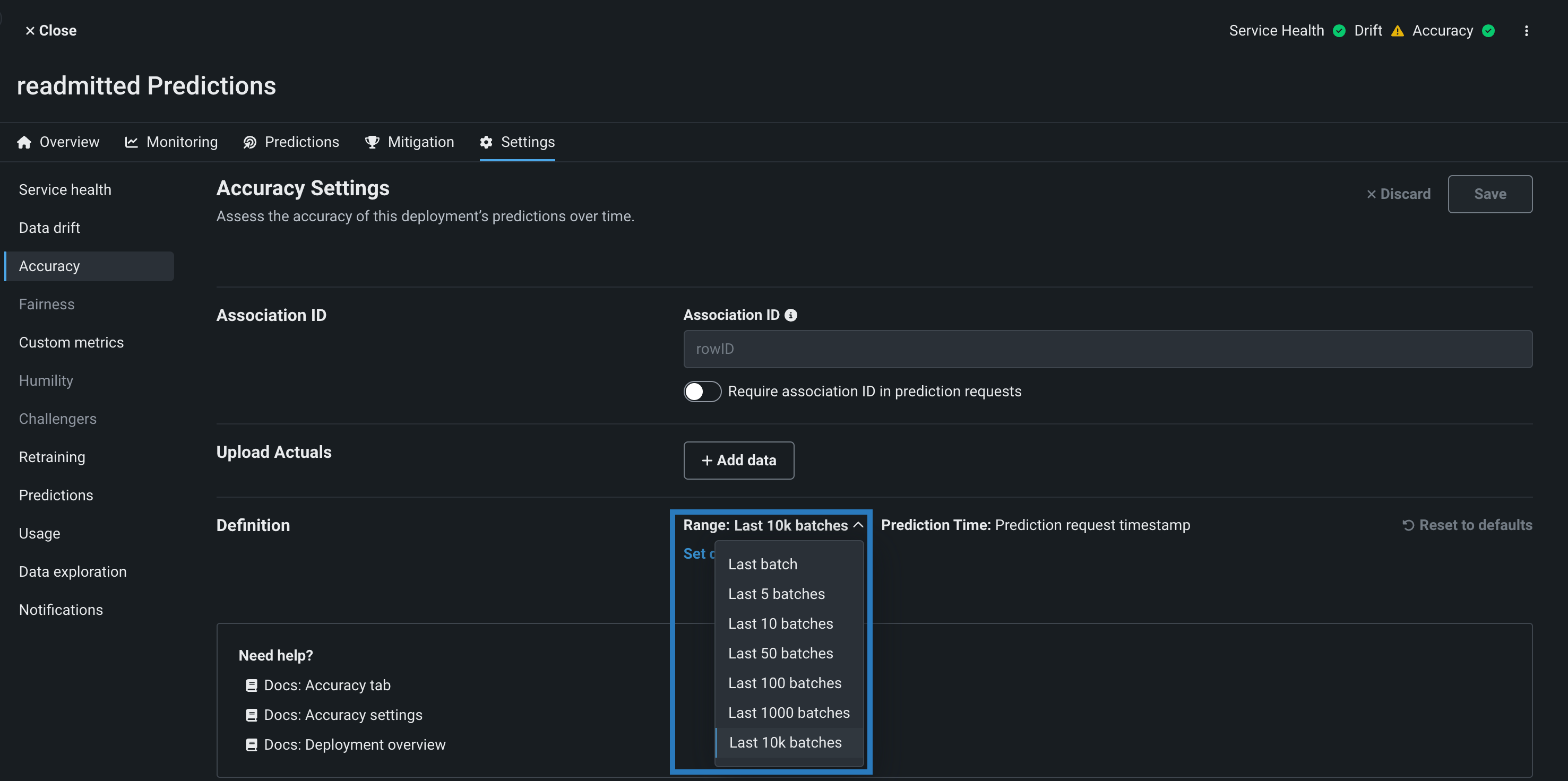 設定 > データドリフトタブの定義セクションで、デプロイインベントリのドリフトインジケーターに含める予測バッチの範囲を選択し、保存をクリックします。