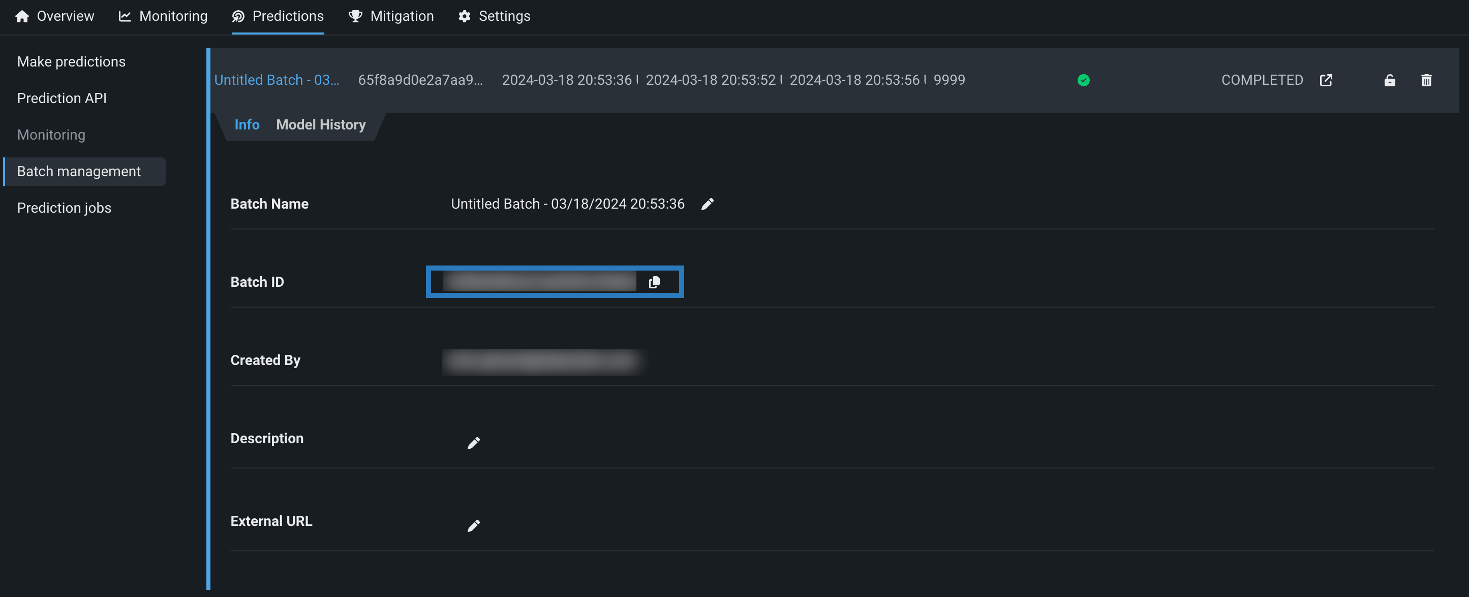 新しいバッチに予測を追加できるようになりました。 エージェントが監視する外部モデルからバッチに予測を追加するには、MLOpsエージェントのtarballで提供されているバッチ監視の例に従います。 例を実行する前に、予測 > バッチ管理タブで、外部予測を追加したいバッチのバッチIDをコピーして保存し、エージェント例の入力引数として使用します。