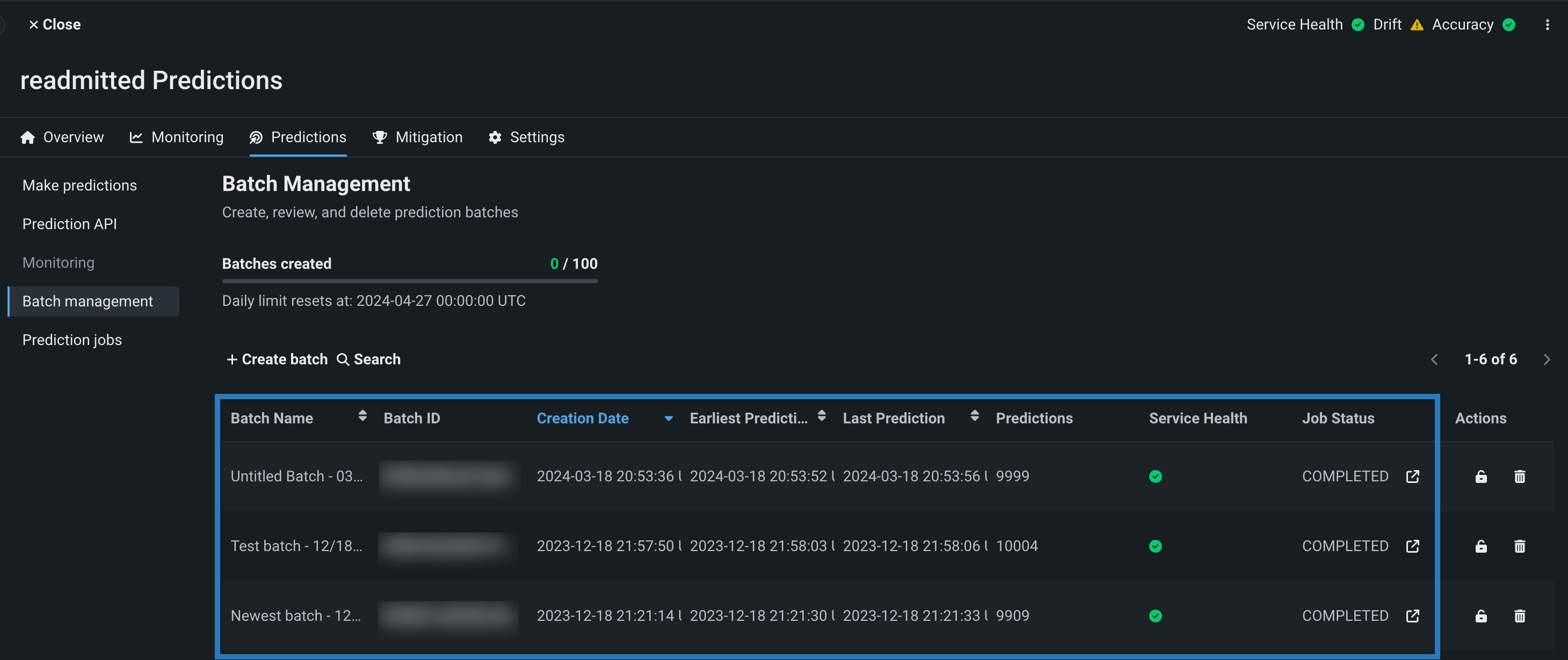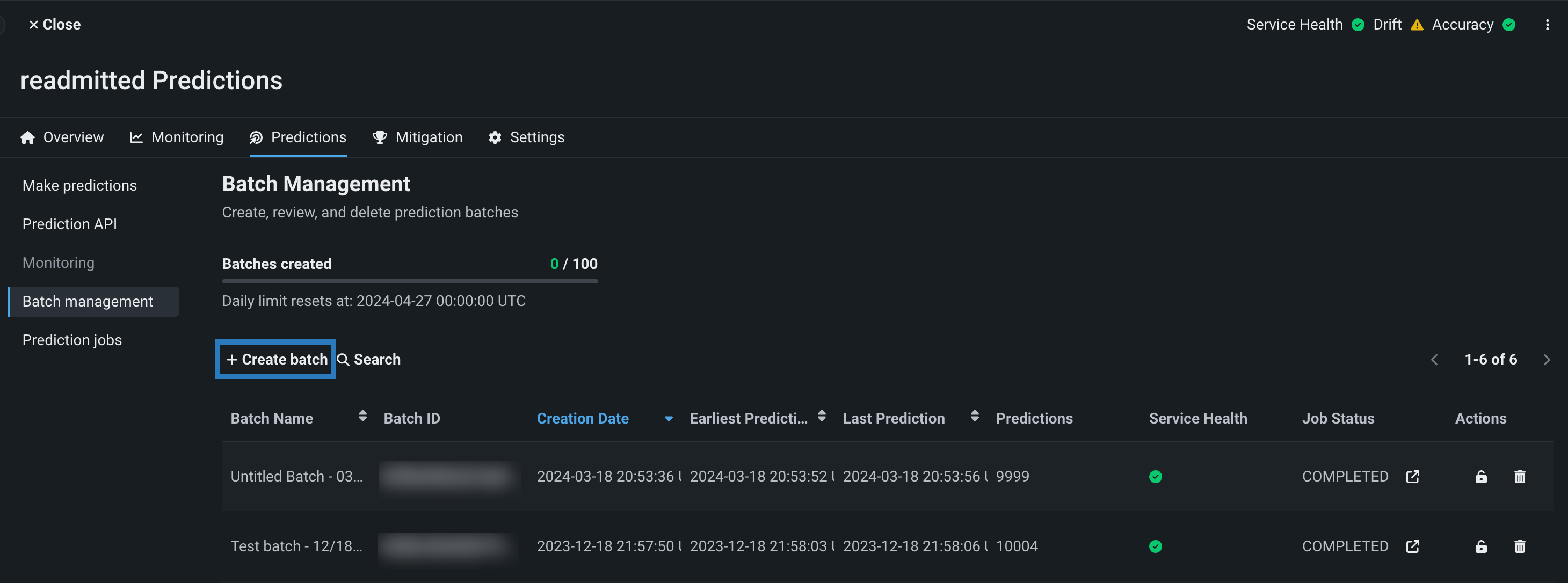 予測 > バッチ管理 タブで、+ バッチを作成するをクリックして、バッチ名を入力し、送信をクリックします。