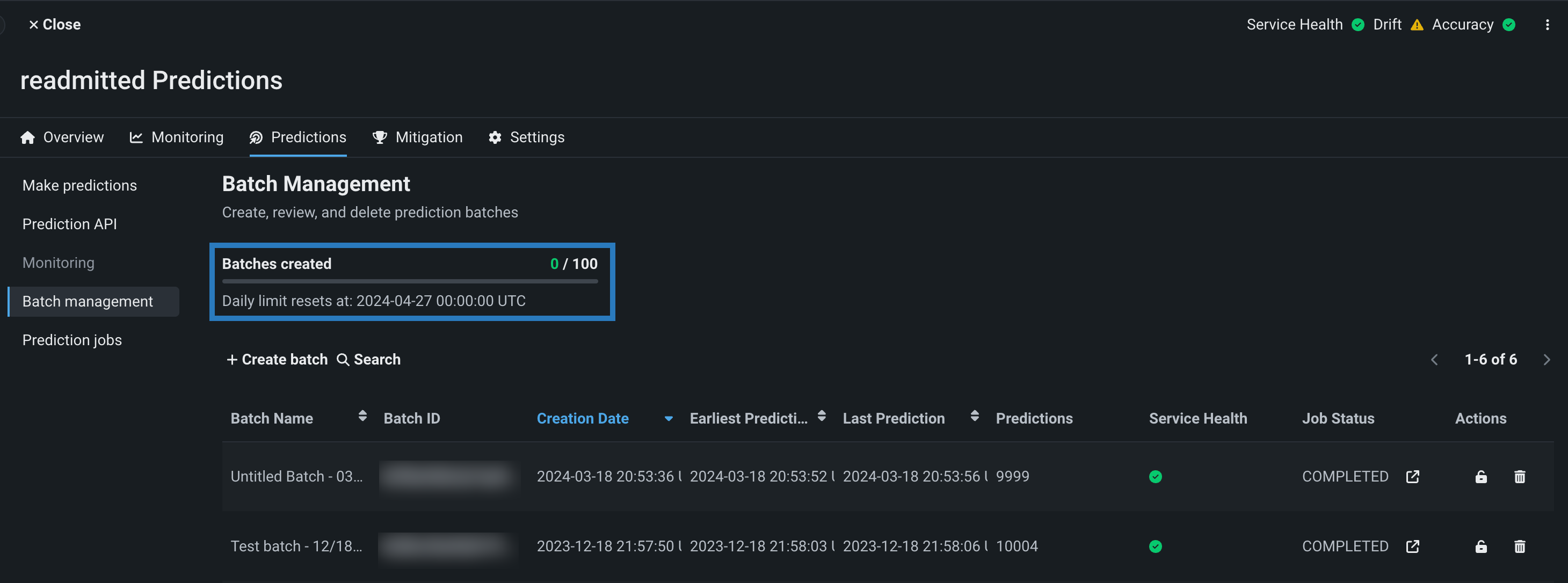 予測 > バッチ管理タブでは、バッチの作成に加えて、さまざまな管理アクションを実行したり、現在のデプロイで1日に作成可能なバッチ数の上限に対する状況を確認したりできます。