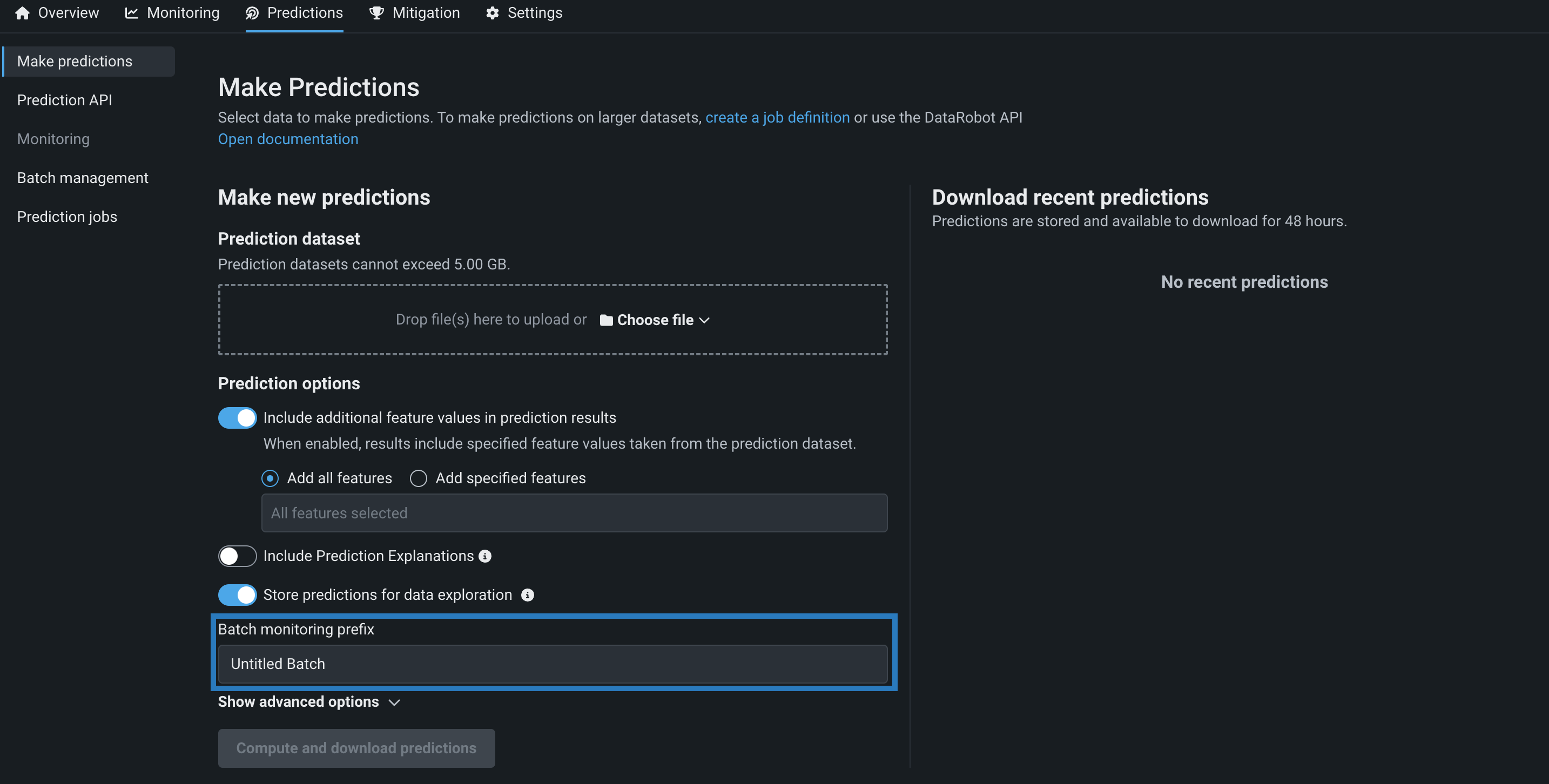 予測 > 予測を作成タブでは、標準のデプロイと同じように1回限りのバッチ予測を行うことができます。ただし、バッチデプロイの場合、バッチ管理タブのバッチ名で予測日時に付加するバッチ監視の接頭辞を設定できます。