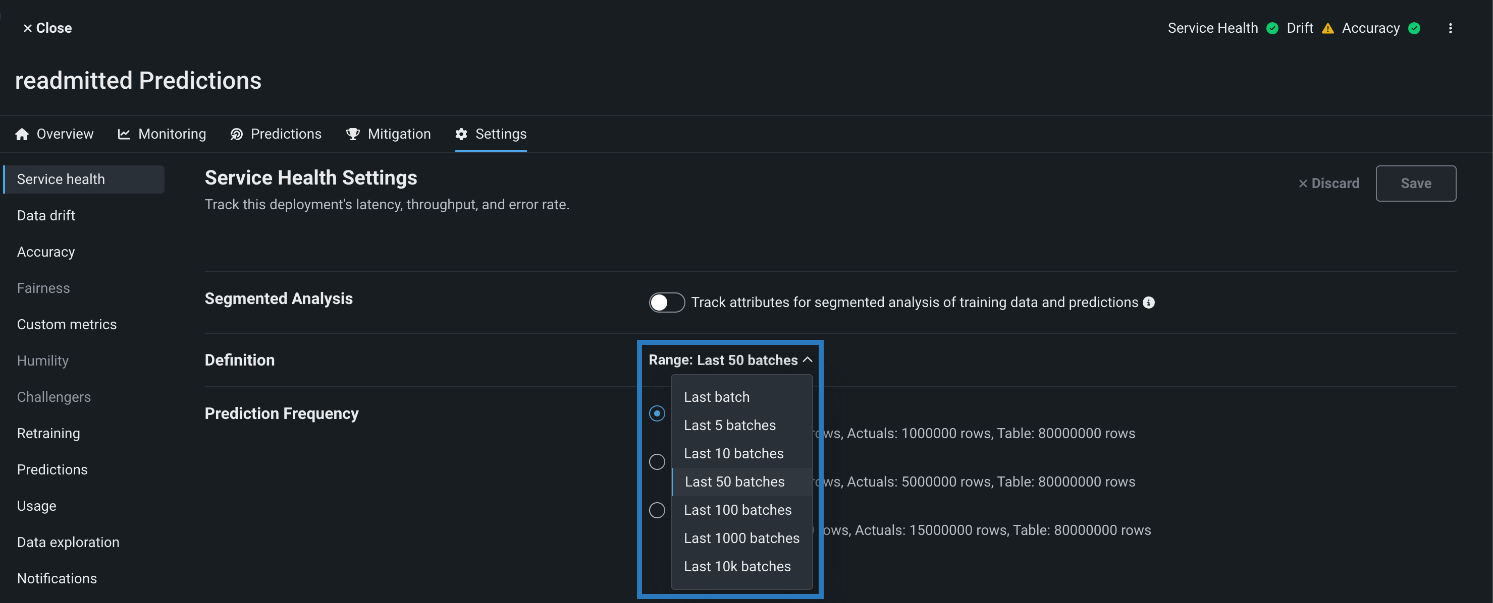 設定 > サービスの正常性タブの定義セクションで、デプロイインベントリのサービスインジケーターに含める予測バッチの範囲を選択し、保存をクリックします。