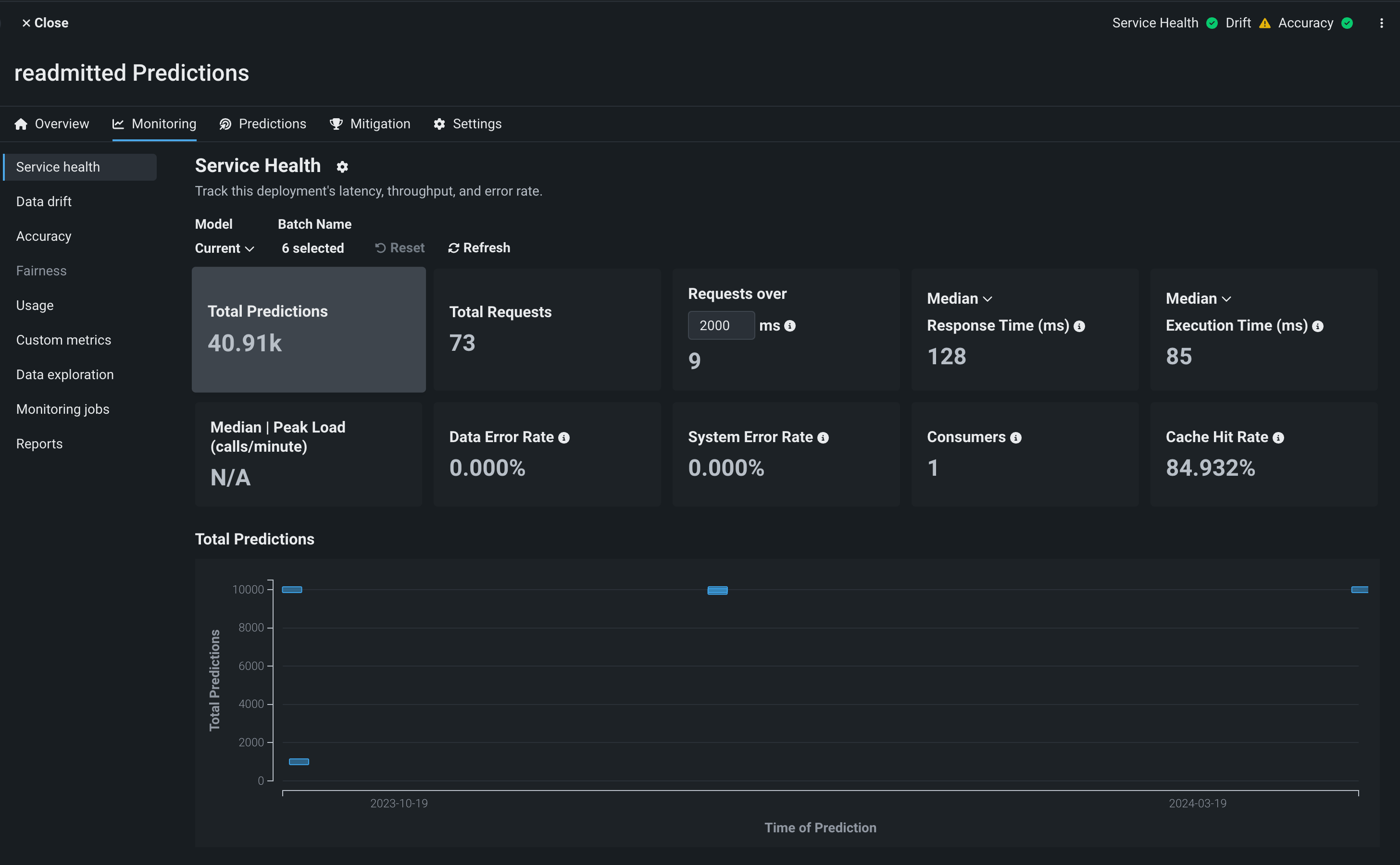 バッチ対応のデプロイでは、時間単位ではなくバッチ単位で整理された監視統計を表示できます。 これを行うには、バッチを作成し、それらのバッチに予測を追加して、デプロイ内のバッチのサービス正常性、データドリフト、および精度の統計を表示します。