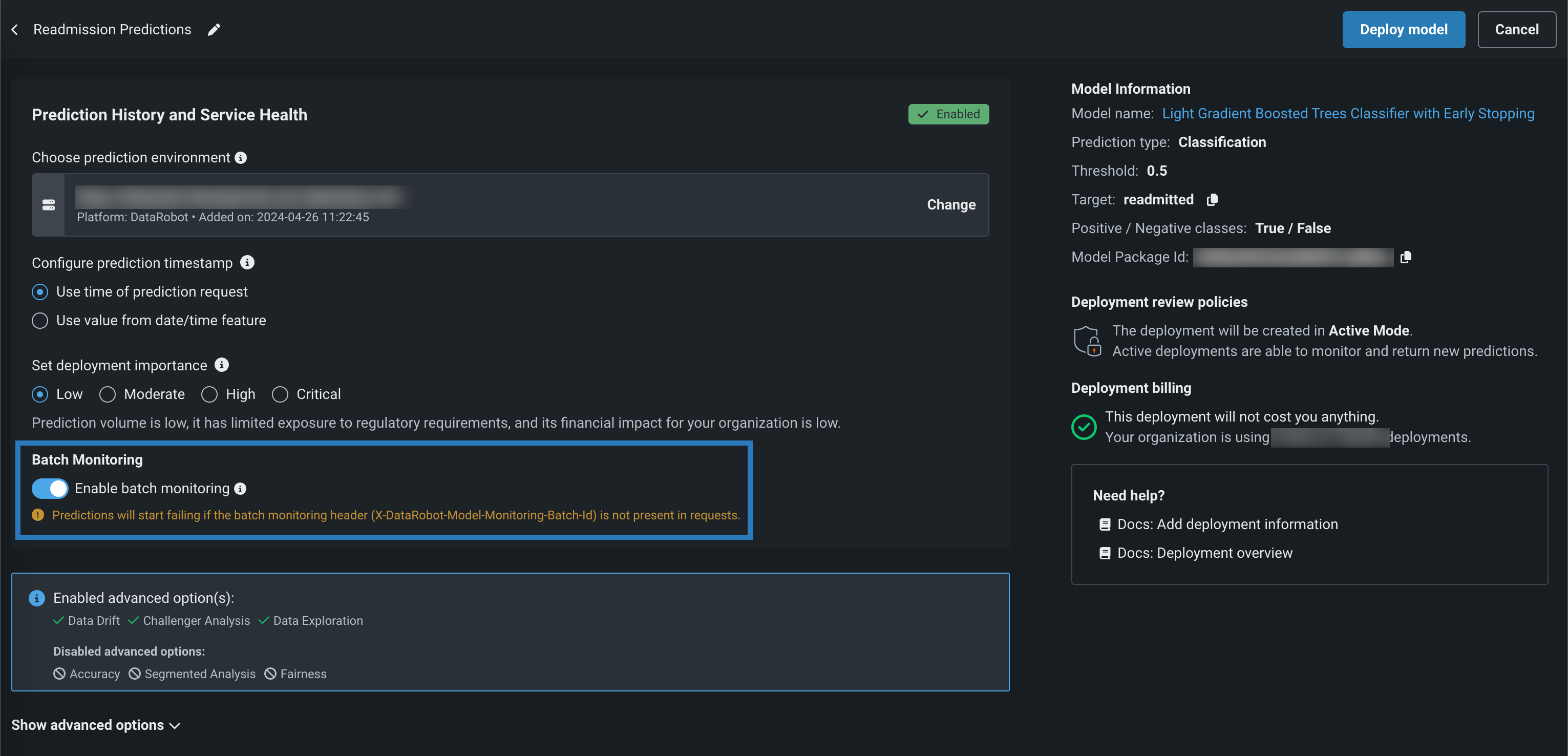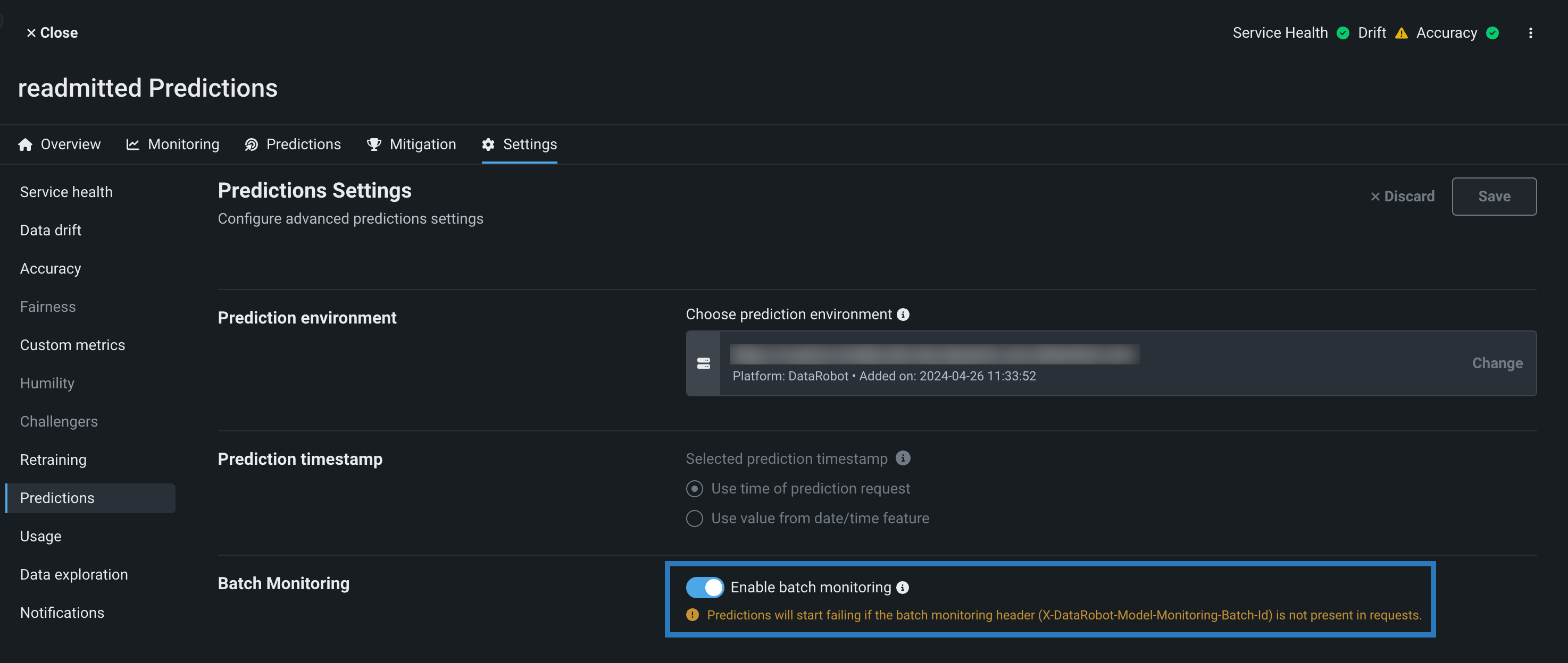 バッチ監視用に設定するデプロイがすでに作成されている場合は、そのデプロイの設定 > 予測タブに移動します。 次に、バッチ監視の下にあるバッチ監視を有効にするをクリックして新しい設定を保存します。