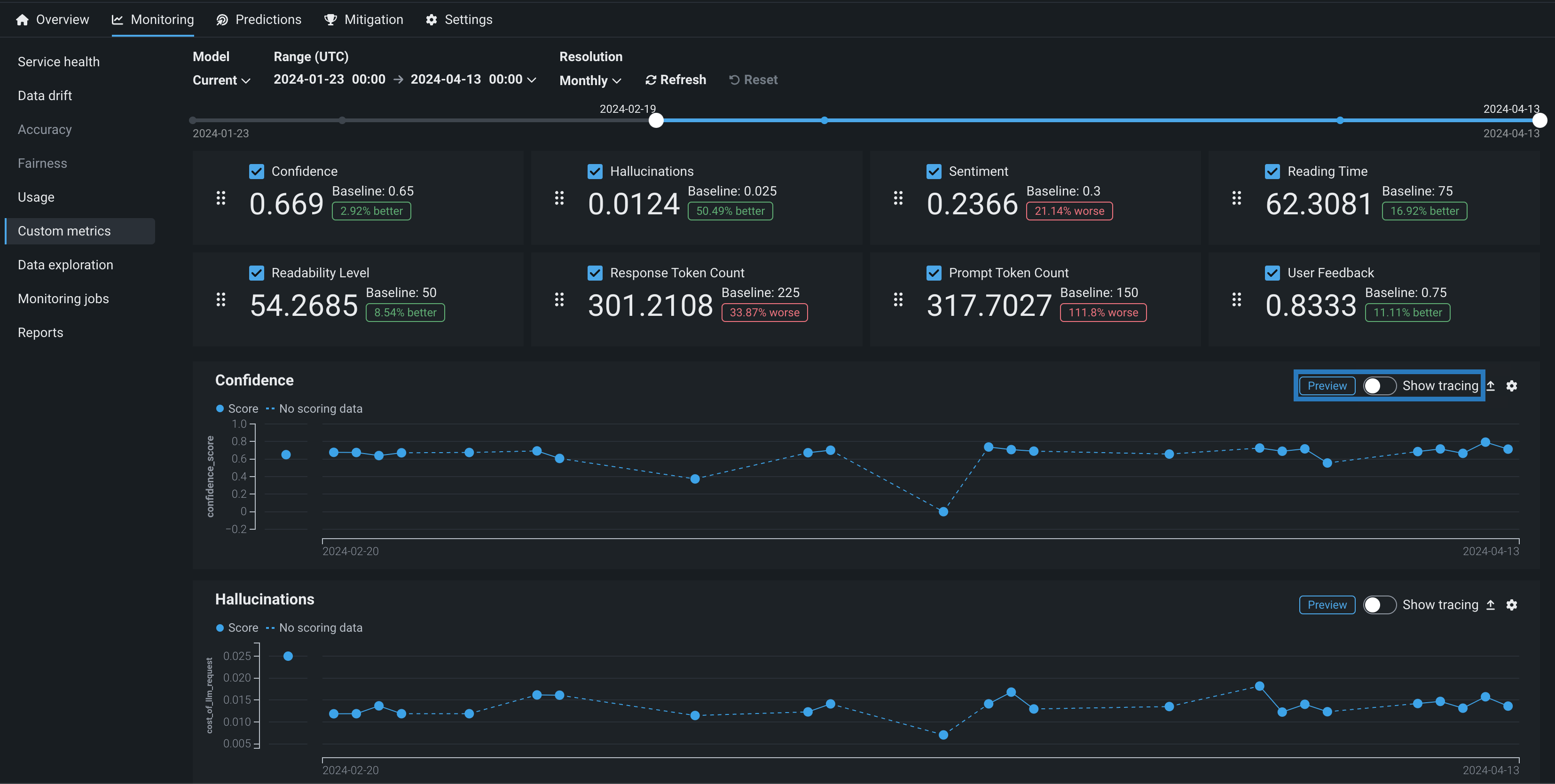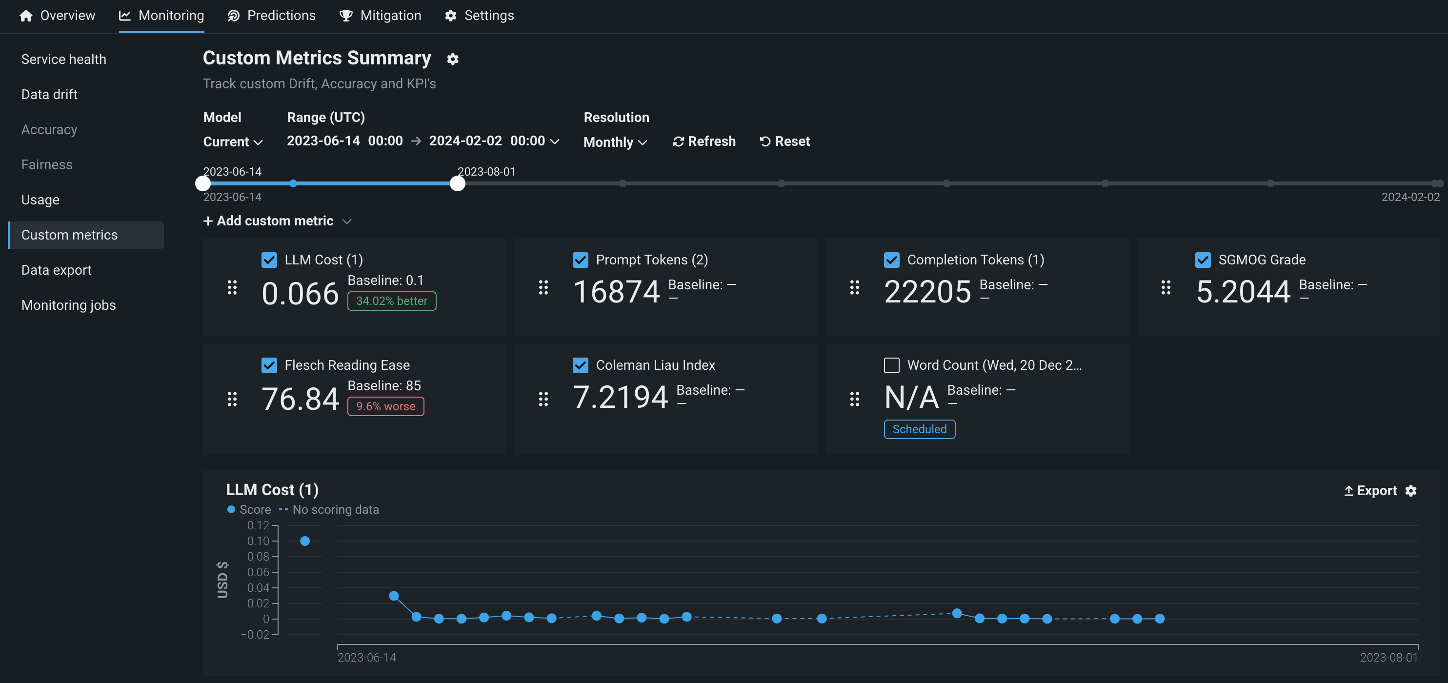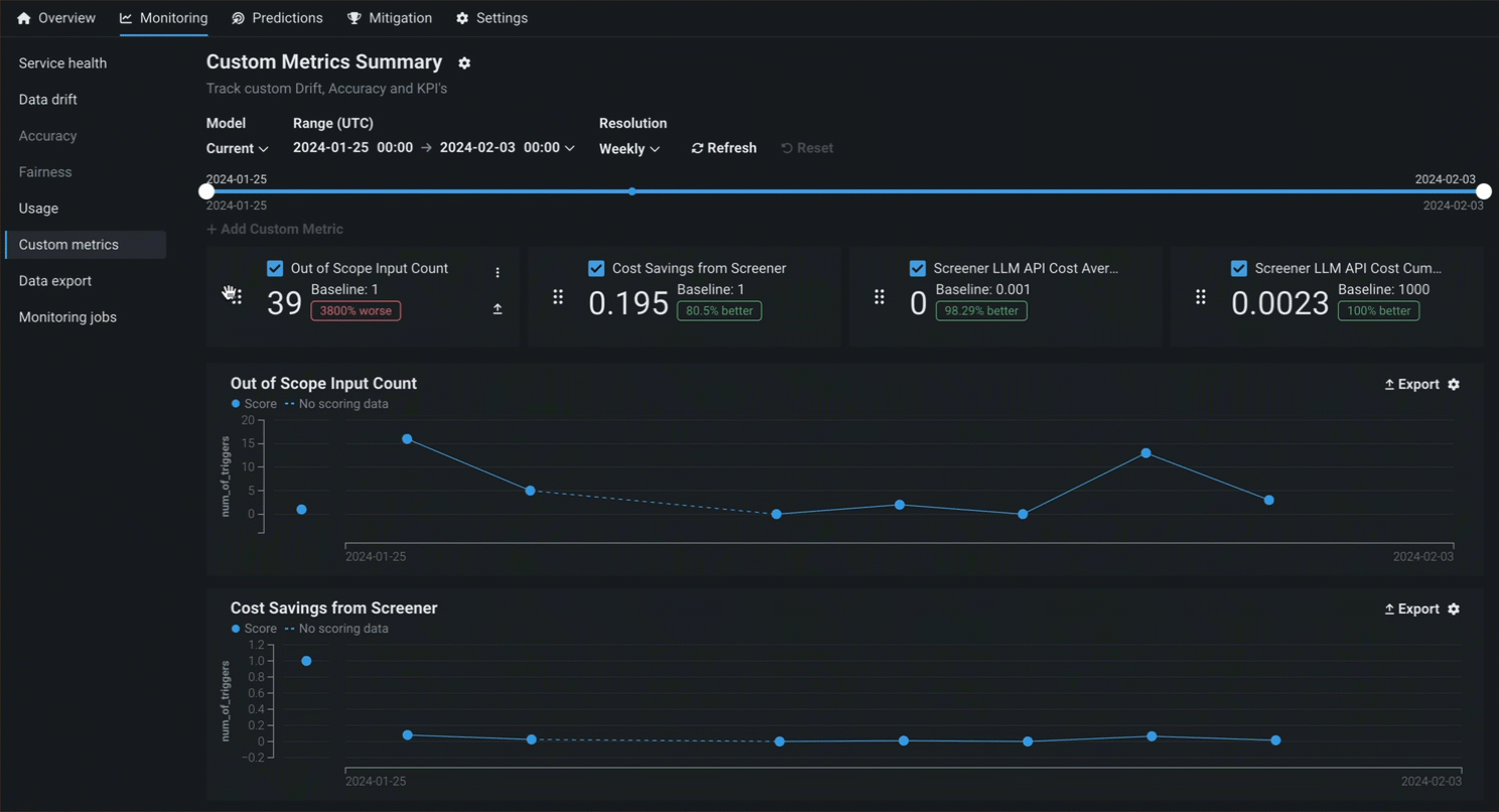 | 新しい外部指標 | 指標の計算がDataRobotによって直接ホストされないカスタム指標を追加します。 外部指標は、DataRobotが保存および視覚化するための指標値を送信するために使用されるシンプルなAPIです。 指標の計算は、ユーザーが外部で処理します。 外部指標は、ノートブック、ジョブ、カスタムモデルなどのDataRobotの他のツール、Airflowなどの外部ツール、またはクラウドプロバイダーと組み合わせて、特定の指標に必要なホスティングと計算を提供できます。 外部カスタム指標は、DataRobotで追跡および視覚化するためにAIソリューションから値を保存するシンプルなオプションを提供します。 たとえば、LLMプロバイダーによって計算されたLLMコストの経時変化を追跡できます。 |