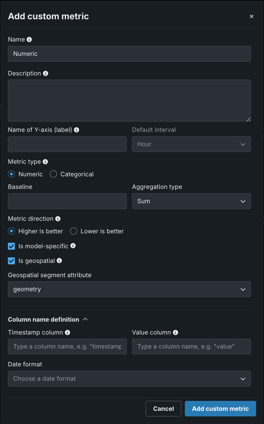 | 地理空間 | カスタム指標で地理空間データを使用するかどうかを決定します。 有効にした場合、地理空間セグメント属性を選択します。 デプロイには、少なくとも1つの地理空間/位置特徴量が必要です。 |