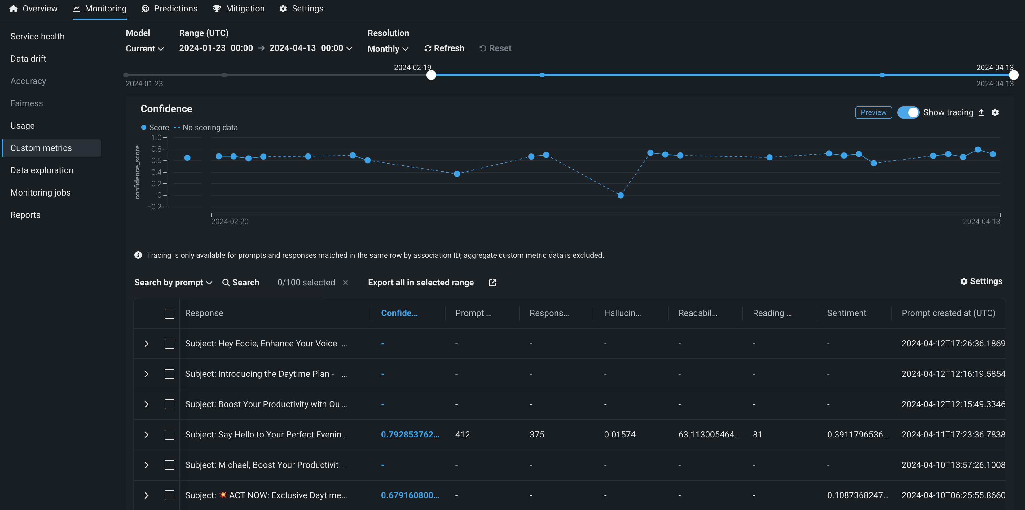 トレーステーブルを使用するには、同じ行でプロンプトと回答を一致させる関連付けIDを定義します。 トレース分析は、同じ行で関連付けIDが一致するプロンプトと回答でのみ利用できます。集計カスタム指標データは除外されます。