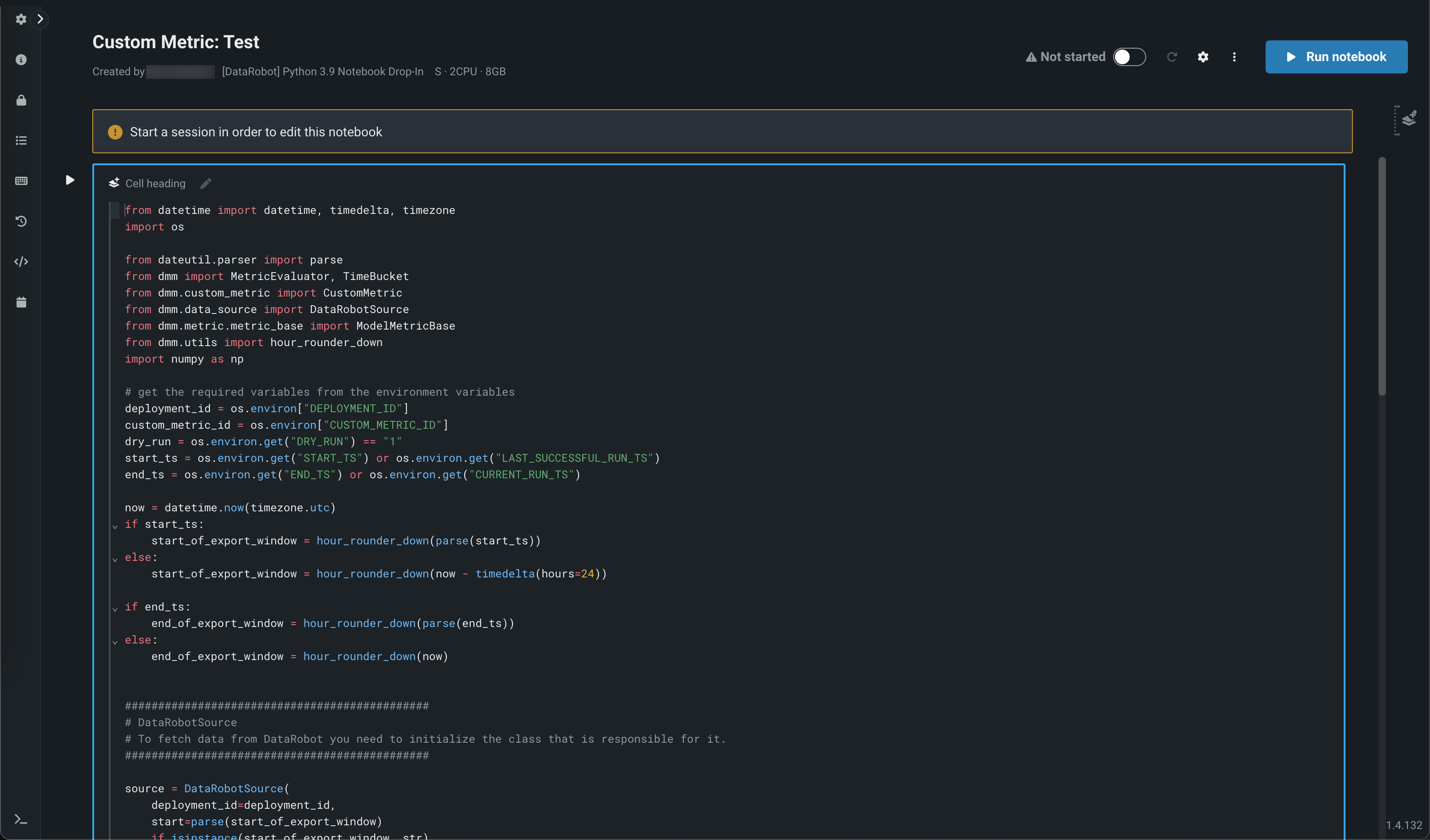 ホストされたカスタム指標のノートブックは、デフォルトではオフになっています。 この機能を有効にする方法については、DataRobotの担当者または管理者にお問い合わせください。
