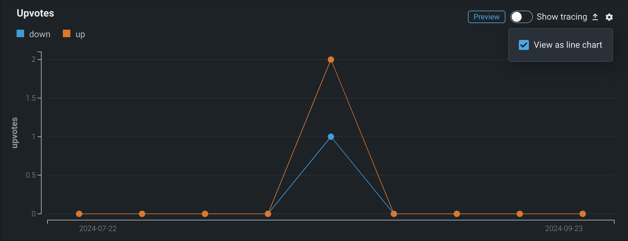 カテゴリーの外部カスタム指標を追加した場合、カスタム指標サマリーダッシュボードの指標チャートは、折れ線グラフまたは棒グラフとして表示できます。 チャートビューを変更するには、プロット領域の右上隅にある設定アイコンをクリックしてから、折れ線グラフとして表示チェックボックスをオン(またはオフ)します。