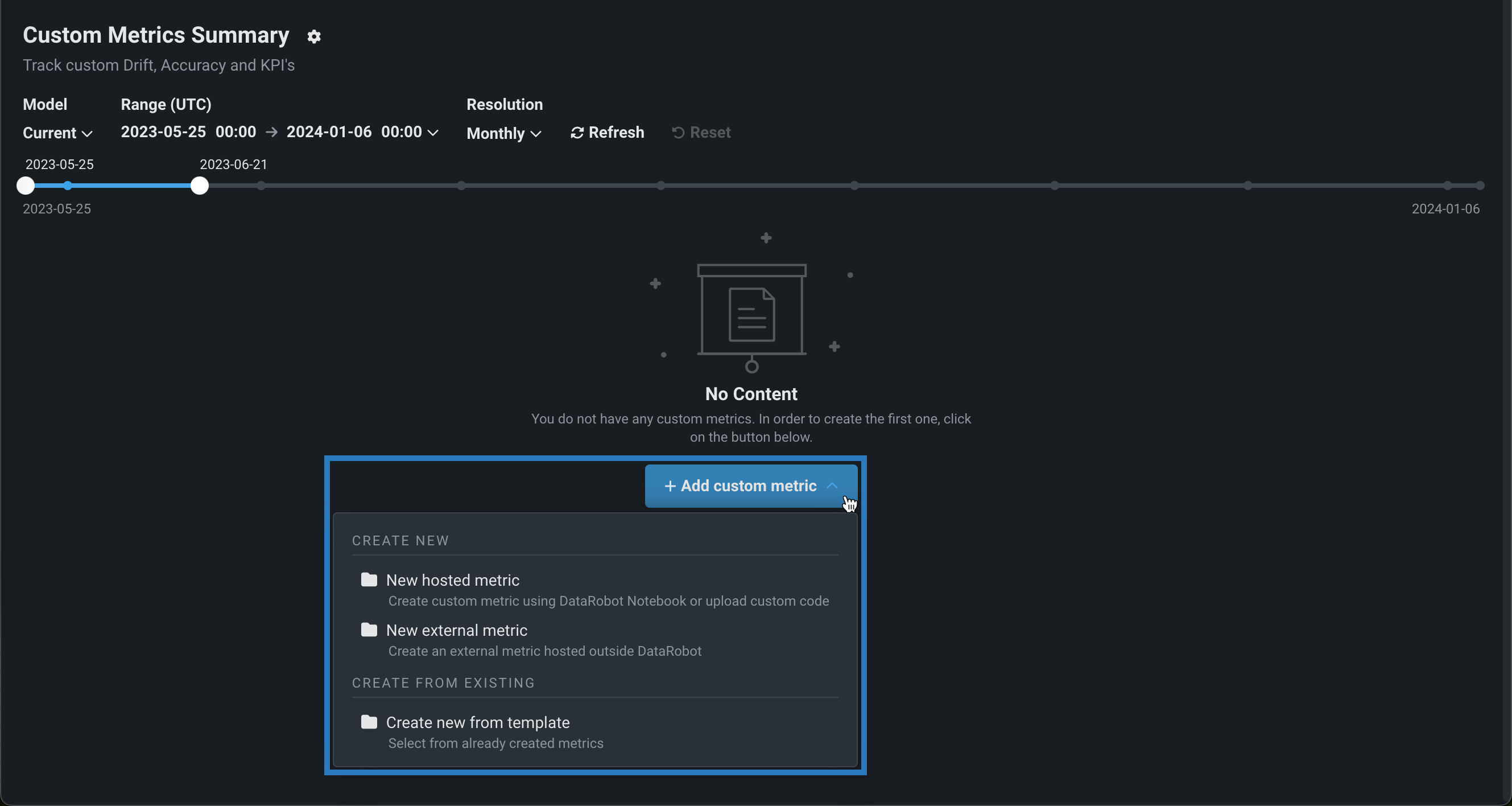 | テンプレートから新規作成 | テンプレートからカスタム指標、またはDataRobotがコードを提供し作成プロセスを自動化するホストされたカスタム指標のすぐに使用できる例を追加します。 指標テンプレートを使用すると、最初から開始することなく、ホストされた指標が生成されます。 テンプレートはDataRobotによって提供され、そのまま使用したり、変更して新しい指標を計算したりできます。 ホストされたカスタム指標テンプレートは、DataRobotが実装例と完全なエンドツーエンドワークフローを提供するカスタム指標を開始する最も簡単な方法を提供します。 数回のクリックで使用できます。 |