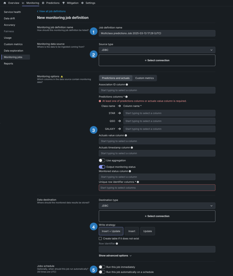 監視オプションセクションでは、予測値と実測値の監視ジョブまたはカスタム指標の監視ジョブを設定できます。