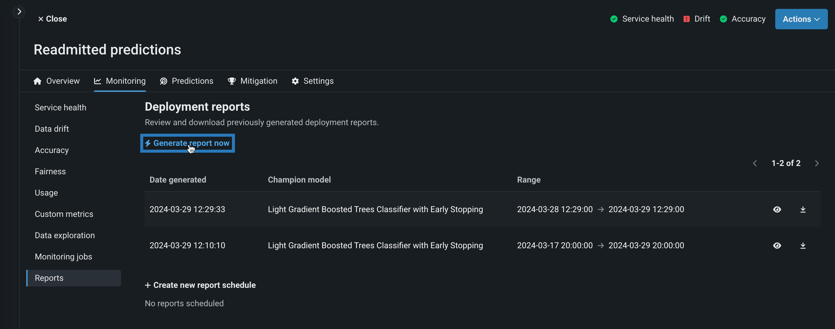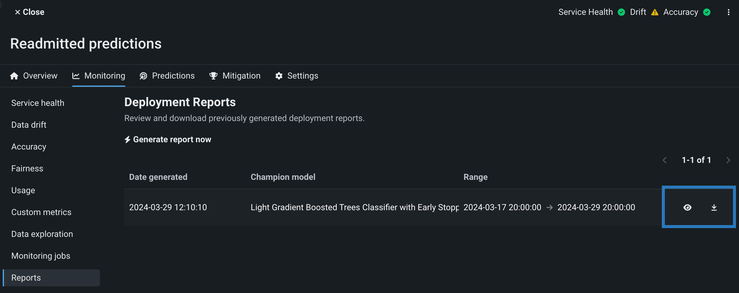 デプロイのレポートを生成するには、デプロイインベントリからデプロイを選択し、モニタリング > レポートタブに移動して、 今すぐレポートを生成 をクリックします。